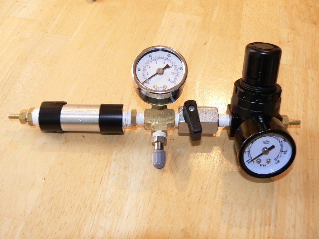 Meter. Meter pipe is machined aluminum rod with 1/4" threads machined on both ends. The regulator is a Mead Fluid Dynamics Mini-Regulator.