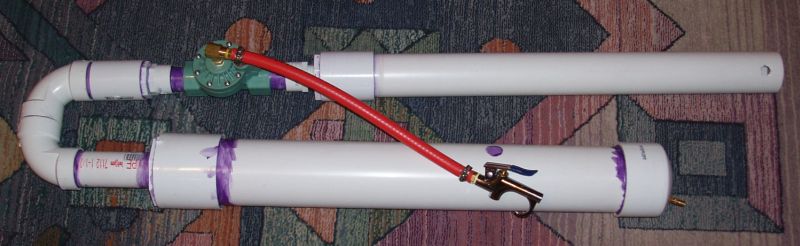 With a larger chamber and longer barrel, it may gain the additional 125 yards needed to meet the goal. This is the launcher configuration that launched the 100 PSI shot. A compressor set to 100 PSI was used.