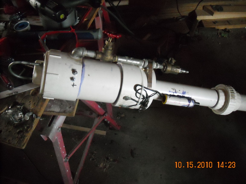 It alo shows the BBQ ignitor held in 3/4"pvc conected 2 drywall screw for a single spark gap. the electrical connectin were soldered and coverd with silicone