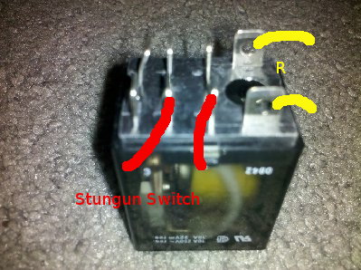 You can see the switch inside the case. The red wires on the edited photo will be the switch for the stun gun. The yellow wires connect to the coil, so the radio should power that to turn on the switch.