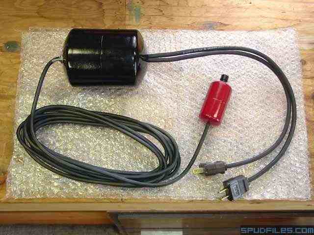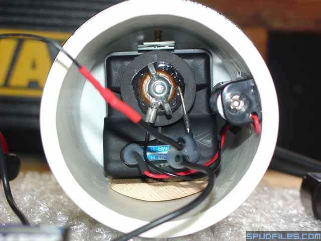 Little bang is a breachloader and has a little 12V chamber fan that I run by use of a 9V battery applied across the fan leads. The most interesting part of Little Bang is its ignition system. It features a 20 foot dual ignition wired remote control. I call the ignition system my "universal" ignition system because I plan to use it on future guns. The heart of the ignition system is an electronic gas grill ignitor module that I purchased from Sears for $16.95 + S&H. After some modest rewiring it provides two 5mm arcs in the chamber - one of which you can see in one of the attached pictures. The remote ignition connects to the gun via two "spark plugs" which I manufactured myself.