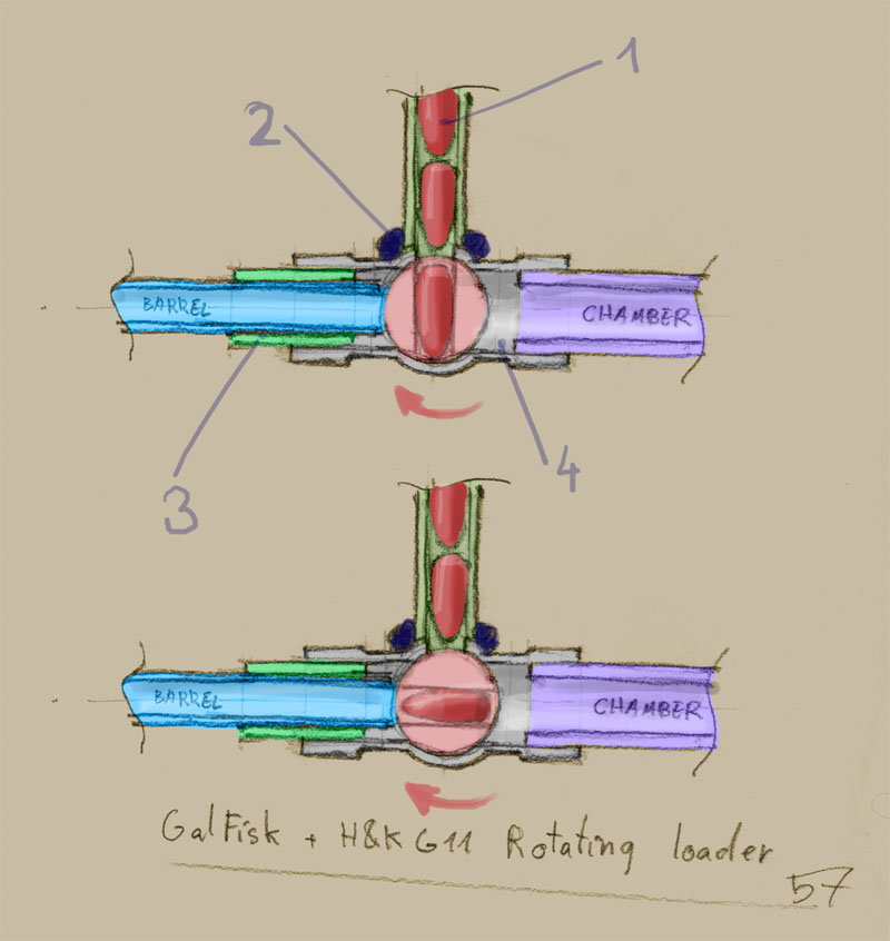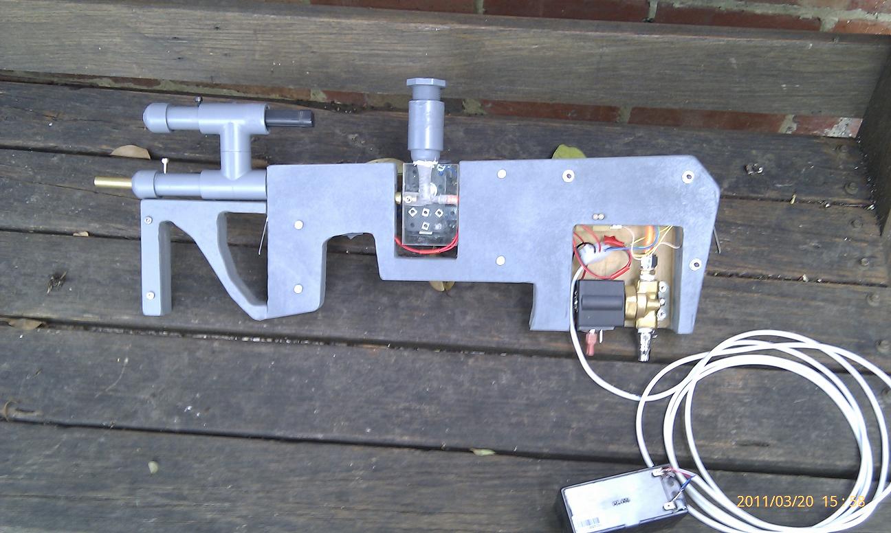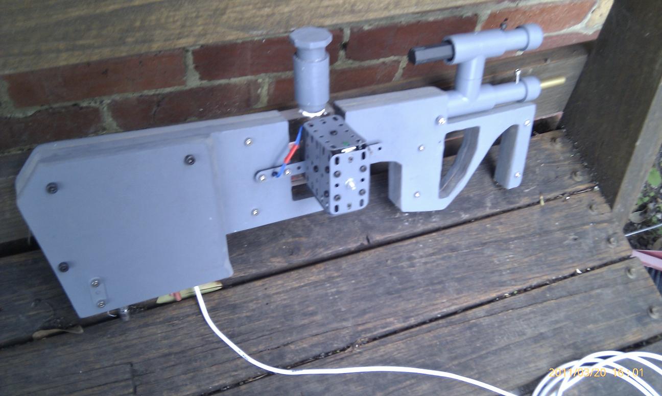 The other thing I tried was to mount the plunger co-axial with the barrel to reduce the form factor; the right angle plunger looks dumb and is bulky. The problem is that given the straight through flow from valve to muzzle there is no room on the breech to fit the plunger in line. I am making a new breech design that has the air feed from the bottom and the plunger at the rear. Gravity still takes care of the feeding, the plunger just prevents more rounds dropping from the hopper.