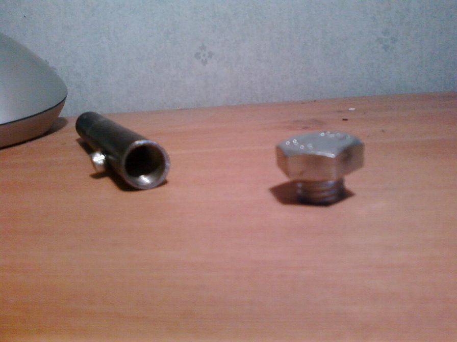 When JSR got the mini-hybrid working on high-mixes, i decided that i want to build something like that. Well today i had time and went to my workshop. Then i saw an old .177 cal airgun barrel. I got an idea, and here it is. Basically i drilled 11mm dia hole about 34mm deep and i left few inches long barrel. the combuction chamber is 11mm x 24mm, so its not big :D . The small screw on the top is for the iongition and has 1mm hole thhrough it, and after i took the pictures i epoxied a wire to it, it has about .1-.2mm spark gap and i can adjust it if i need. I tapped screws to the bottom of the combustion chamber to alloy me to plug it with a bolt. Today or as soon as i can ill epoxy a presta valve to the bolt so i can feed this baby :D . heres a picture of it