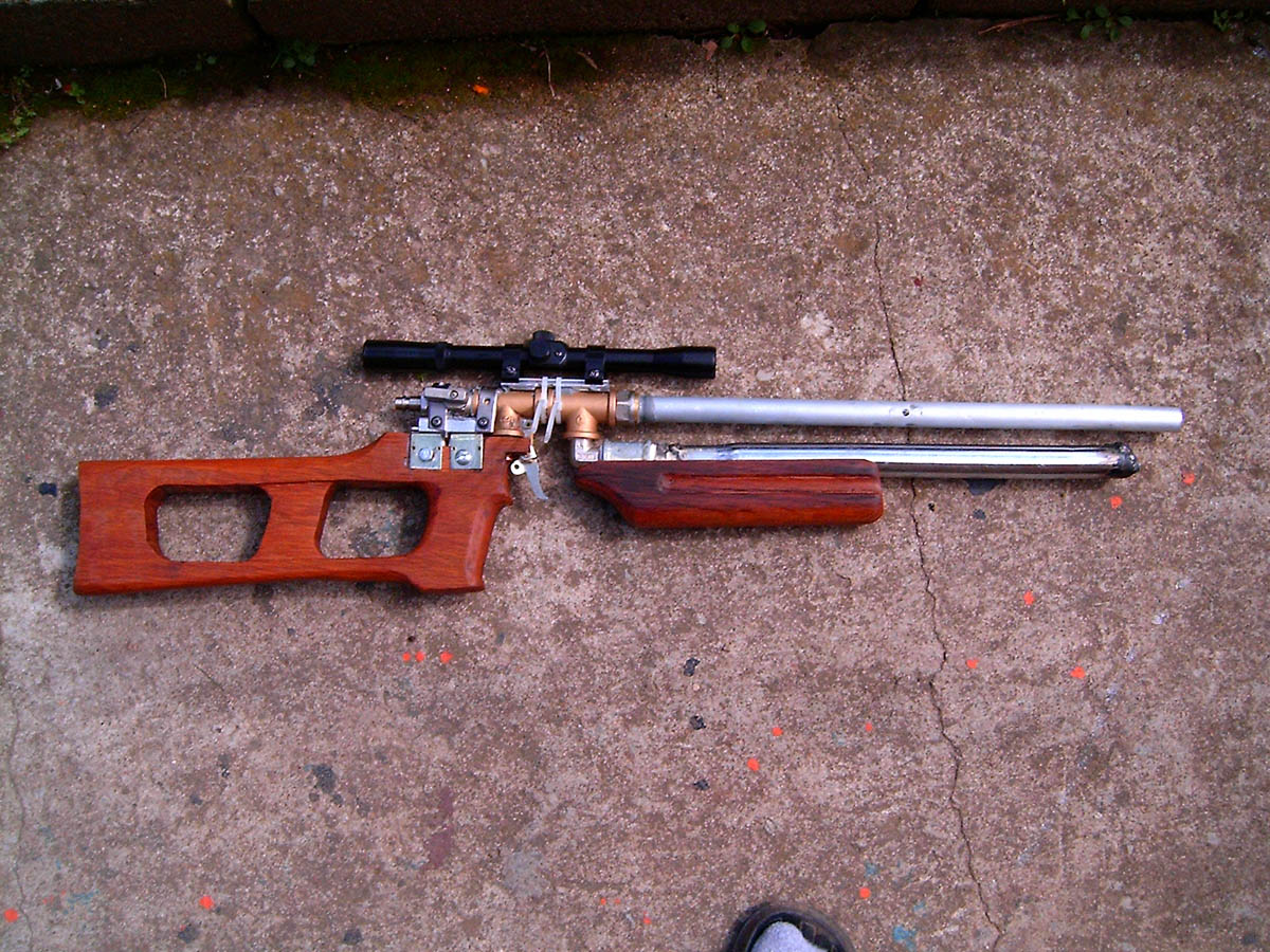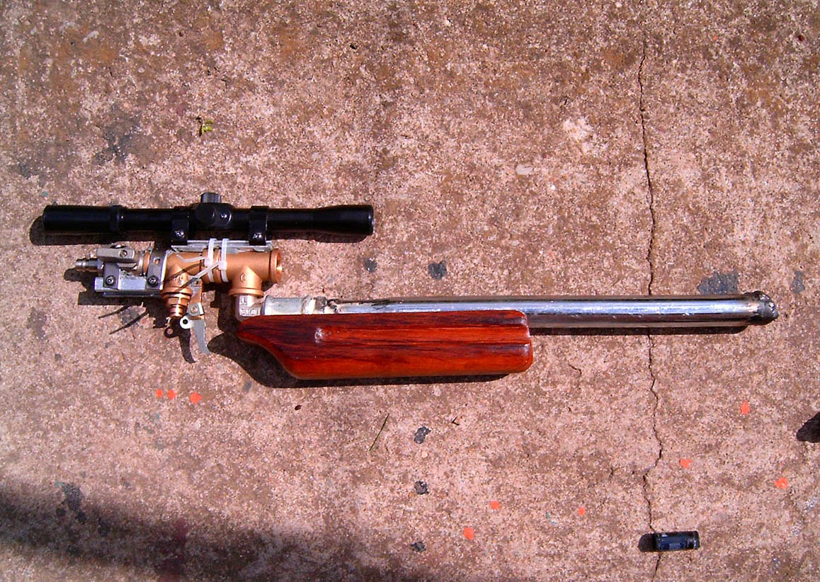 I am not sure what is the preassure, because i dont have manometer. The scope is attached just for the photos, but i'll fix it latter. The barrel is bronze pipe glued in wider aluminium pipe to protect it form bending. The connection between the barrel and the gun is from the same type of valve that i used for the pilot soldiered on the bronze pipe. For ammo I use short pieces of 7mm nails, because i can't find proper size lead shots. At the moment, the gun is not very accurate because I don't have working sights, so I hardly hit bottle size targets 20 meters away.