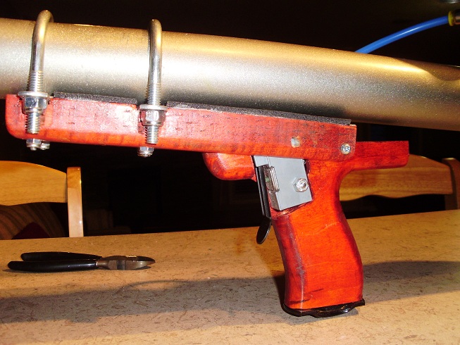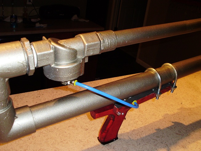 Pretty standard sprinkler valve pneumatic. 36" x 1.5" tank, 48" x 1" barrel. Actuated by a toggle valve.