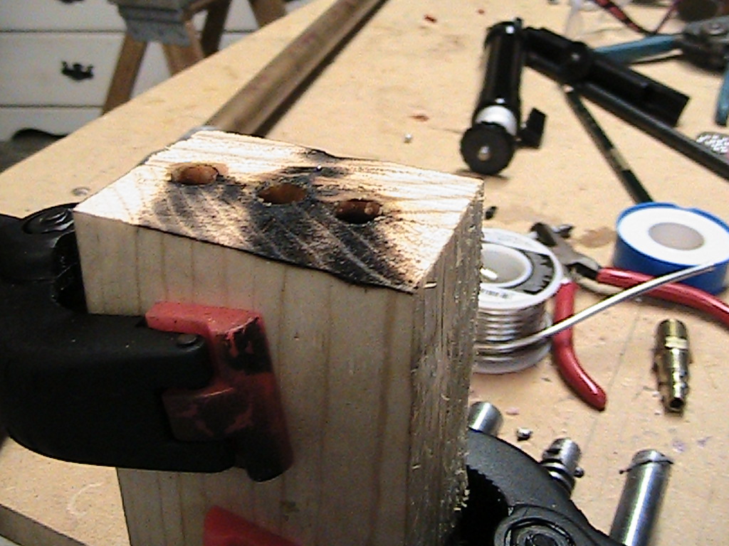 the block is two wood pieces with three .25 holes drilled roughly 15mm deep. i put flux on the inside and then use a blowtorch to melt solder into the holes. then i take off the clamps and retrieve my bullets.