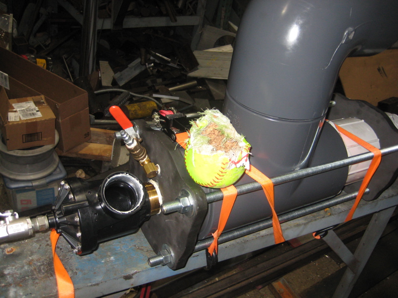 The photos here represent a shortened version of the above to verify it working. We did clock a softball at 711mph with a 10 barrel while the cannon dragged itself, the steel sawhorse and operator back 24". First time I really felt the need to wear a cup and welding helmet while firing.