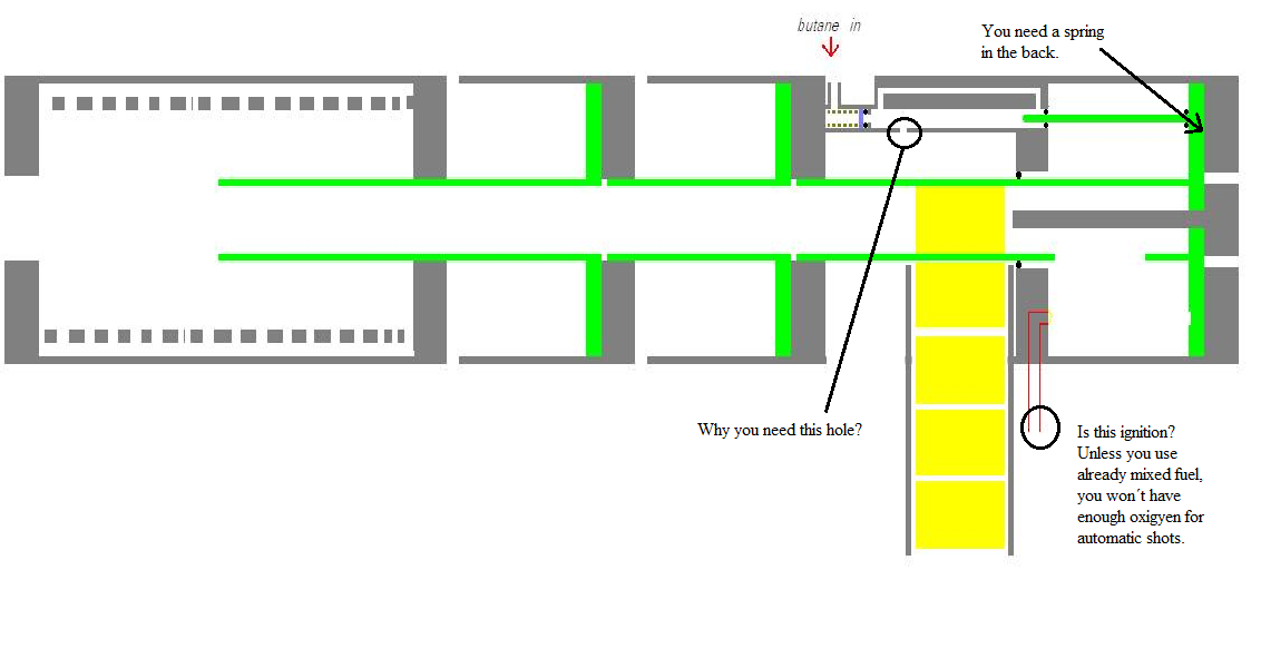 Lol I didn't understand your diagram, but even through that it won't work, first the "butane in "port won't allow any butane in,probably you draw the one way valve in the wrong direction. The rest of o-rings I don't understand any of them, I don't see how the reload mechanism work either.