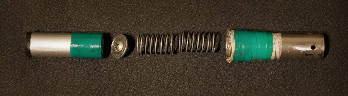 The piston (shown below) is lightly sprung which stops leaks forming when initially filling the chamber with air (it still leaks below 20 psi). The piston slides inside the casing of an old AA battery, this along with some electrical tape and oil makes for a near air tight seal.