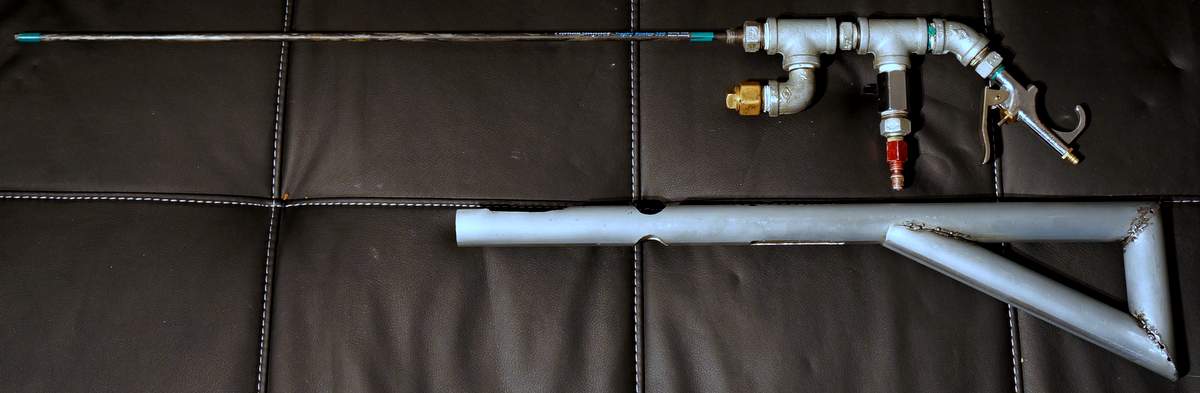 Holes were then cut and filed until the gun was able to slot in place, its an interference fit with the galvanized elbow, and a 'securing' screw holds the hook on the blowgun firm. Its a surprisingly secure fit, yet removal is simple.The finish on the stock was achieved by scrubbing it with scouring pad and then clear coating it. Its a nice finish that photos don't do justice.
