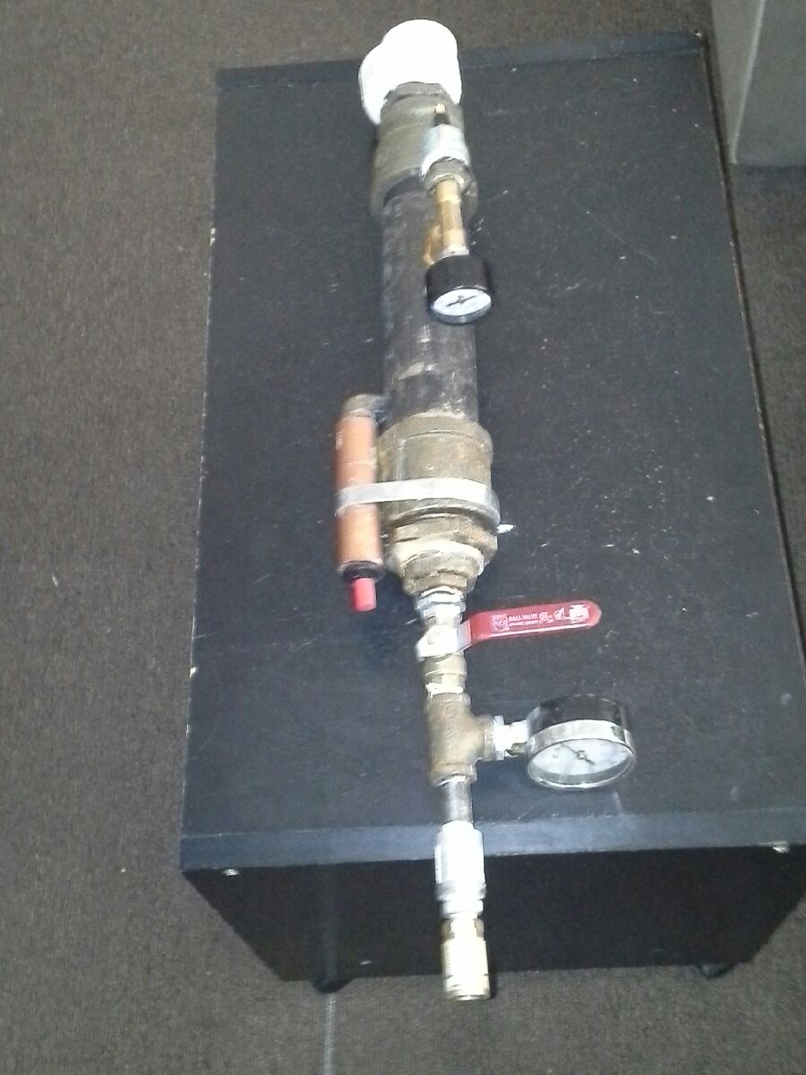 I finally was able to complete my latest build yesterday. This is a basic, run of the mill, hybrid cannon. It has a 48" chamber, propane meter pipe is 1" in volume with a quick connector. The Schrader valve stem is in the center of the chamber and is teed along with a 200 psi gauge. There is also another 200 psi gauge behind the ball valve that separates the meter pipe from the chamber. I only about it at a3x mix but it has much potential!!! Any feedback would be great.