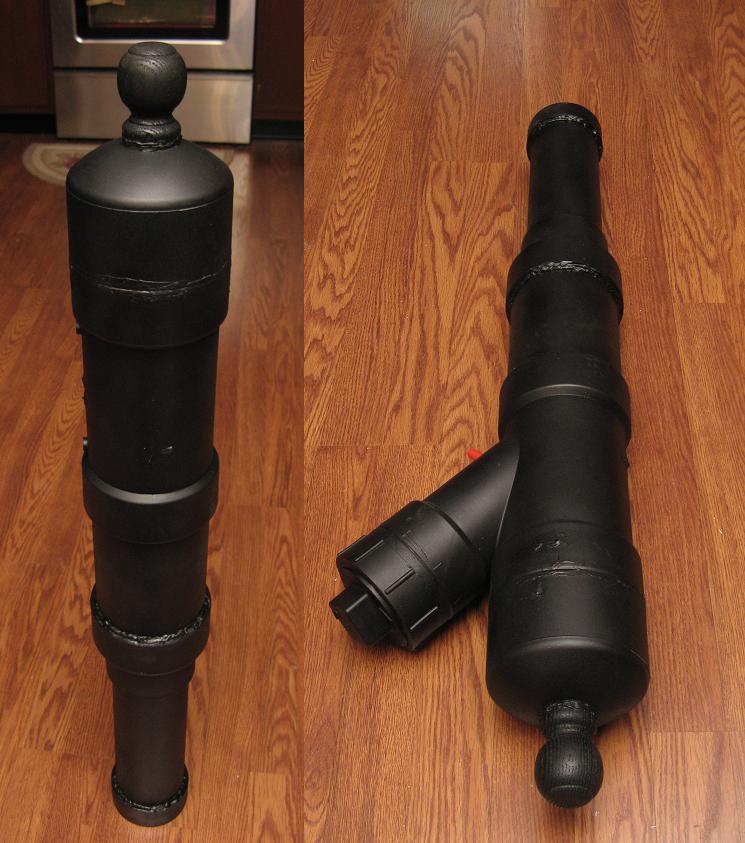 I put a shot 2" rail on th ebottom so i can use a rifle tripod to make it some what portable. Use a large 1/4" door hinge pin in the reducer to stop the balls from rolling down into the breech. Also helped support the cannon while i painted it. I hung it from that pin a few times.