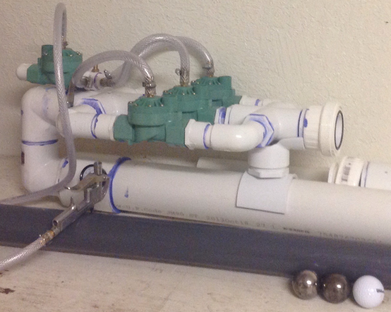 A little info about the pilot valve. When I first started testing I was using a brass cross fitting and a blow gun to pilot all three valve. Well this worked it wasn't ideal. There was a slight delay( 1/10 of a sec maybe? ) before the valves opened. After changing to the sprinkler valve pilot the trigger responds instantly and with authority.