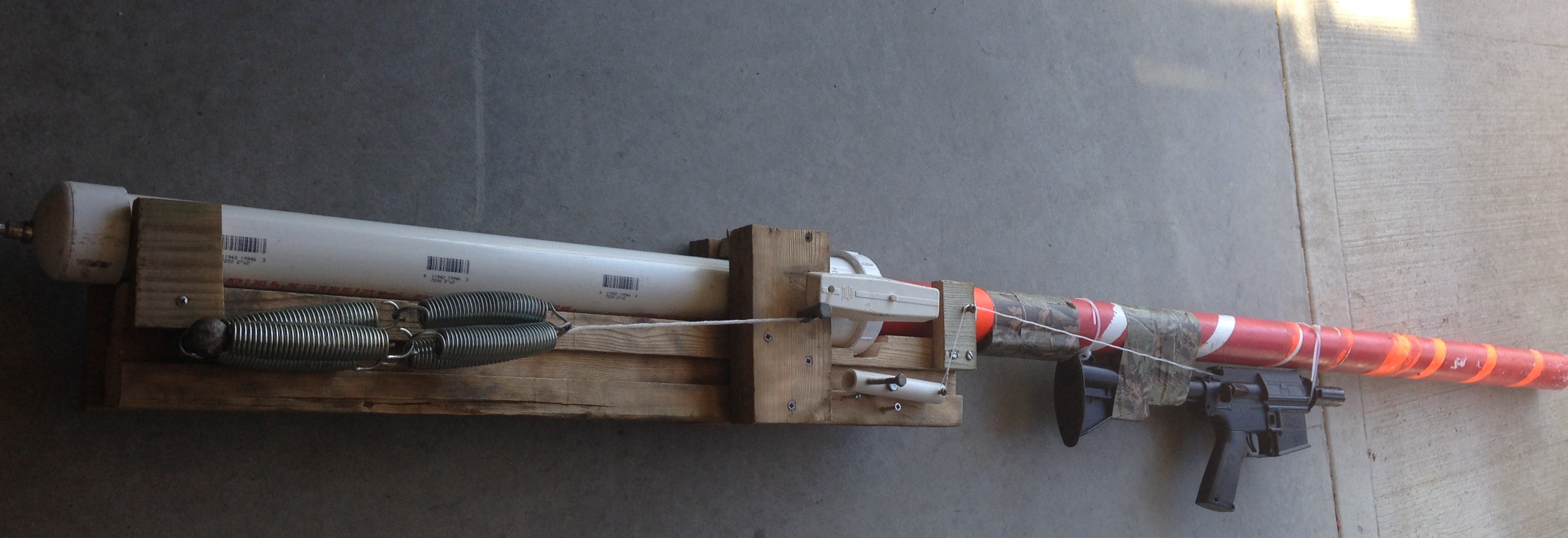 Basically it is a very strong string (I use 10+ strands of strong fishing line) some very strong 30-50 LB springs (depending on the build multiple) a sear that keeps the valve from opening once closed and a trigger to push the sear out of the way when you pull the trigger. Again it is very hard to describe the set up so watching my video on it will be helpful if you plan to duplicate this. Smaller build for my shotgun: Larger build for my air cannon:
