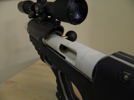 So I made some changes to the gun... I received in the mail my 10.5" long 1 in 12" twist rifled long Colt barrel. Got it here: http://www.ebay.com/itm/45-Caliber-Rifl ... 1628797451 I made a bolt action mechanism using 1" PVC pipe. I created a new upper receiver to mount the scope.