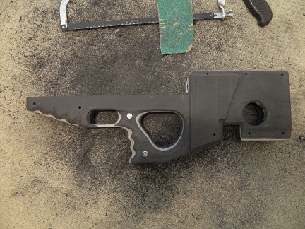 I think the only innovative design aspect of the gun is the stock I made for it. It's a clamshell! It's made out of flattened and laminated ABS DWV pipe. I cut the shapes out using a soldering iron with knife attachment. I joined the layers using ABS cement. And I devoted long hours to sawing, carving, and sanding it for ergonomics. There is an upper and lower receiver which are easily joined/separated with a single bolt and wingnut. I really enjoyed working with ABS because you can weld it, melt it, glue it, cut it, drill it, bend it, impress it, and even mold it too. You have to be careful about what you breathe so I invested in a respirator with a charcoal filter. This was handy for using the soldering iron on the plastic!