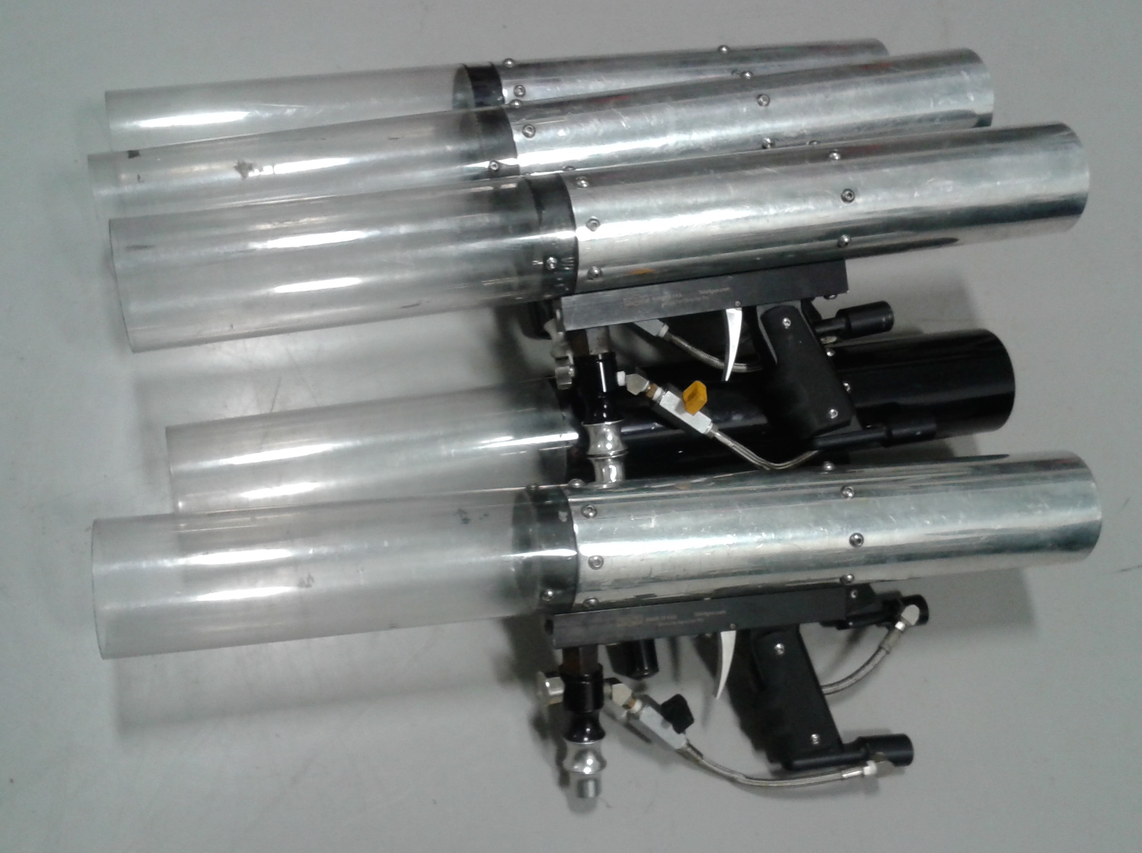 Thanks for showing that. That's a really great design. I love the short piston travel and front-mounted configuration of the piston housing because that preserves chamber volume. I tried to design my last cannon that way years ago when I first started thinking about a piston hybrid design, but I couldn't find a way to vent a low volume, front-mounted housing like that in a way that i was happy with, but it makes perfect sense for a pneumatic.