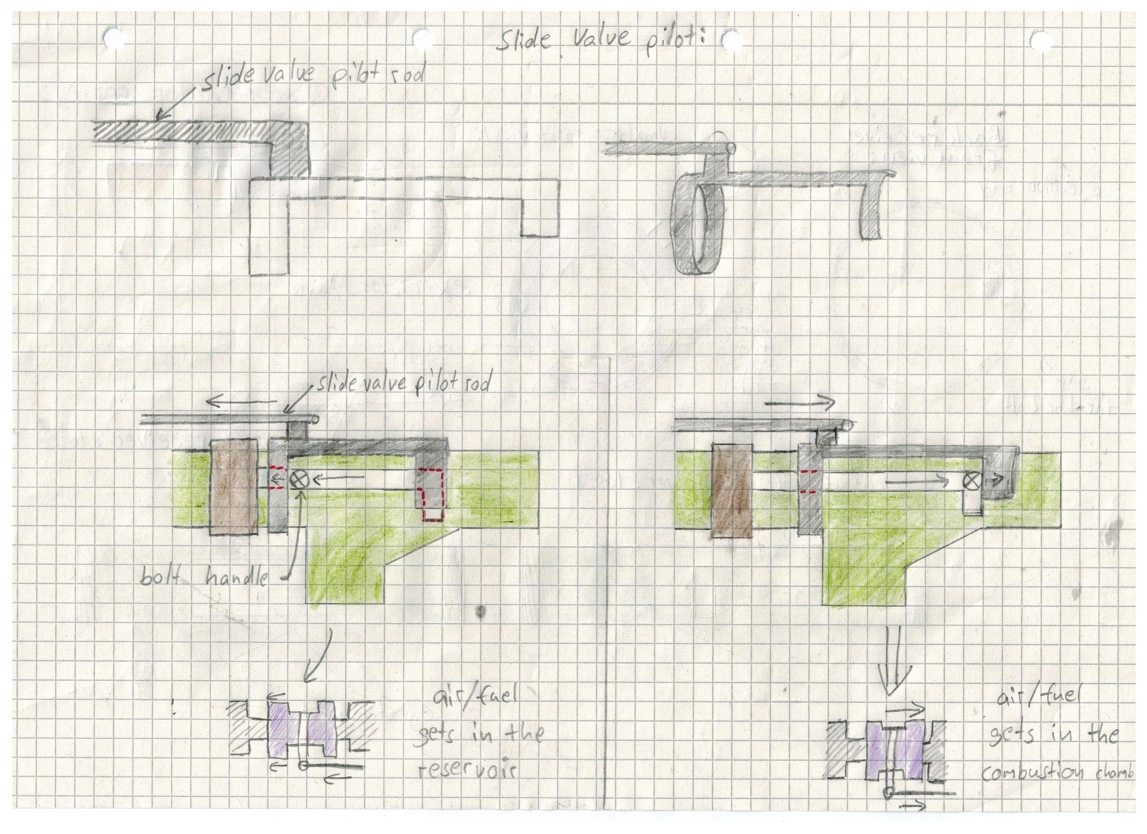 If you push the bolt handle forward again to put in a new round and close the action, you'll also push the front part of the pilot forward and the slide valve will release the gas from the reservoir into the combustion chamber and the gun is ready to fire again.