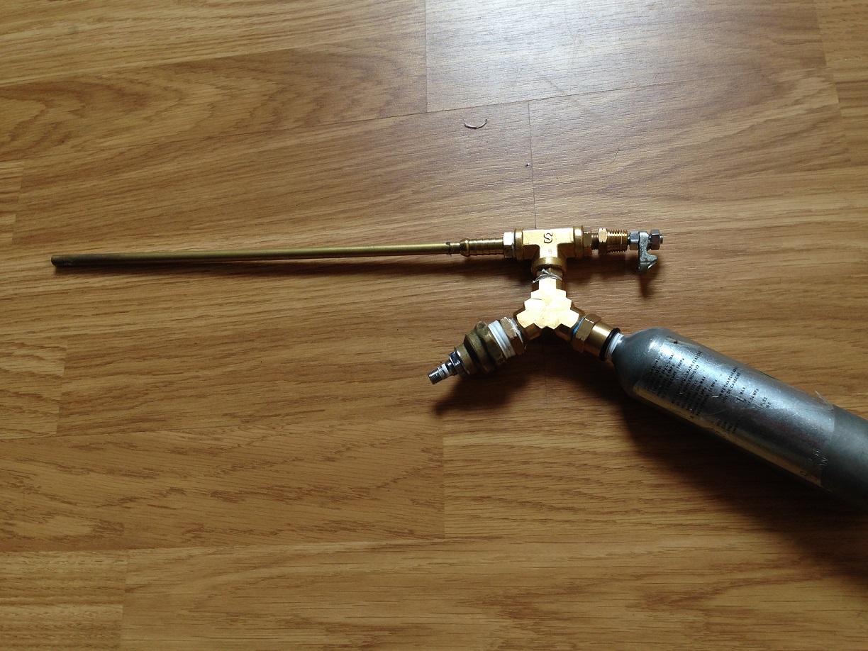 The air tank itself is an old aquarium CO2 canister with some of the thread removed to allow for full flow and a proper fit inside the screw fittings. A 3/8" to 1/4" reducer attaches the tank to the system.