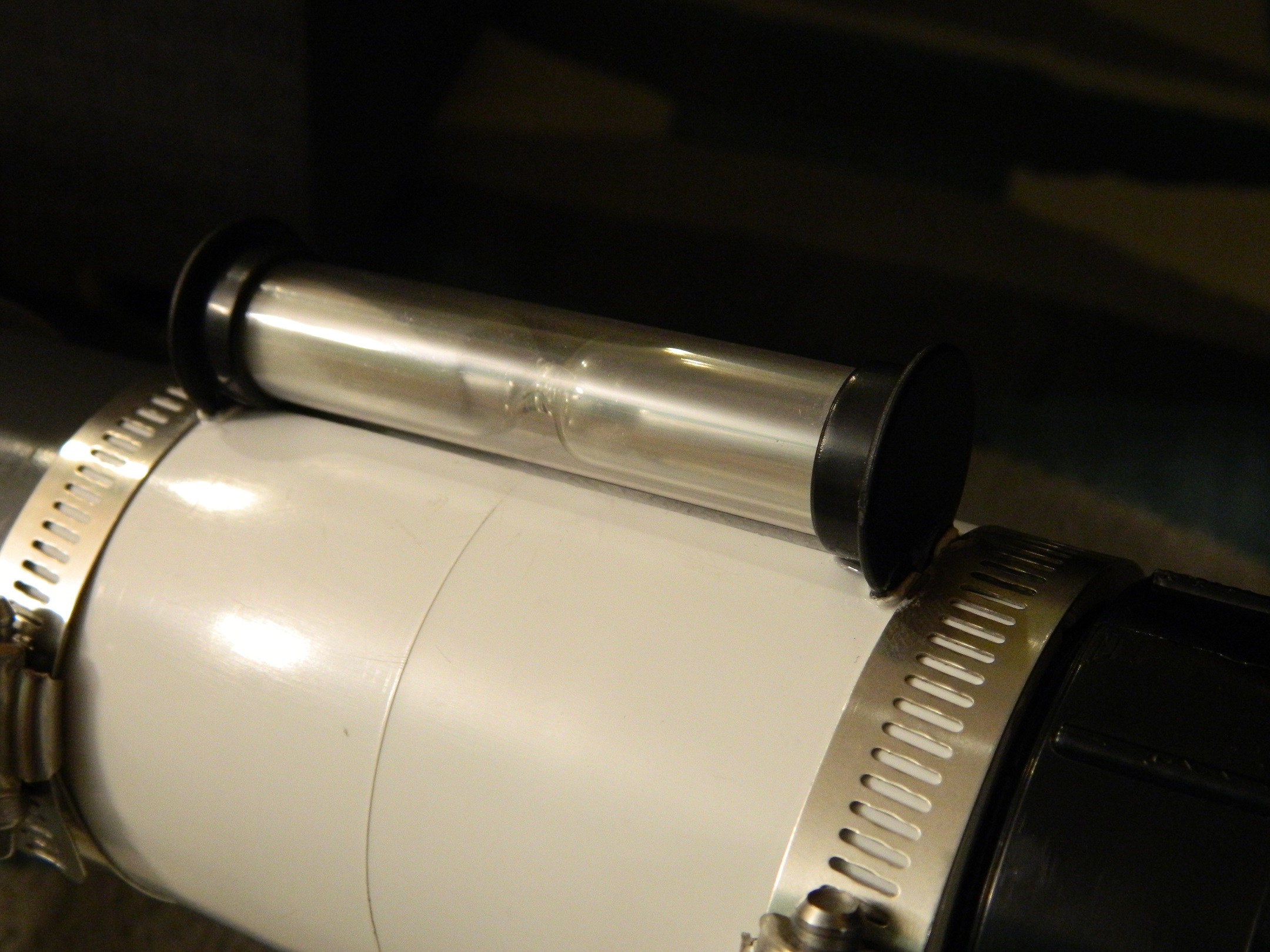The ignition system consists of two copper wire electrodes that meet in the center of the tank and are connected to a BBQ igniter. The electrodes are fastened through the 2" ABS adapter so that no holes in the weed sprayer tank are made. This is meant to maximize the strength of the tank. The electrodes are sealed with rubber washers on the inside.