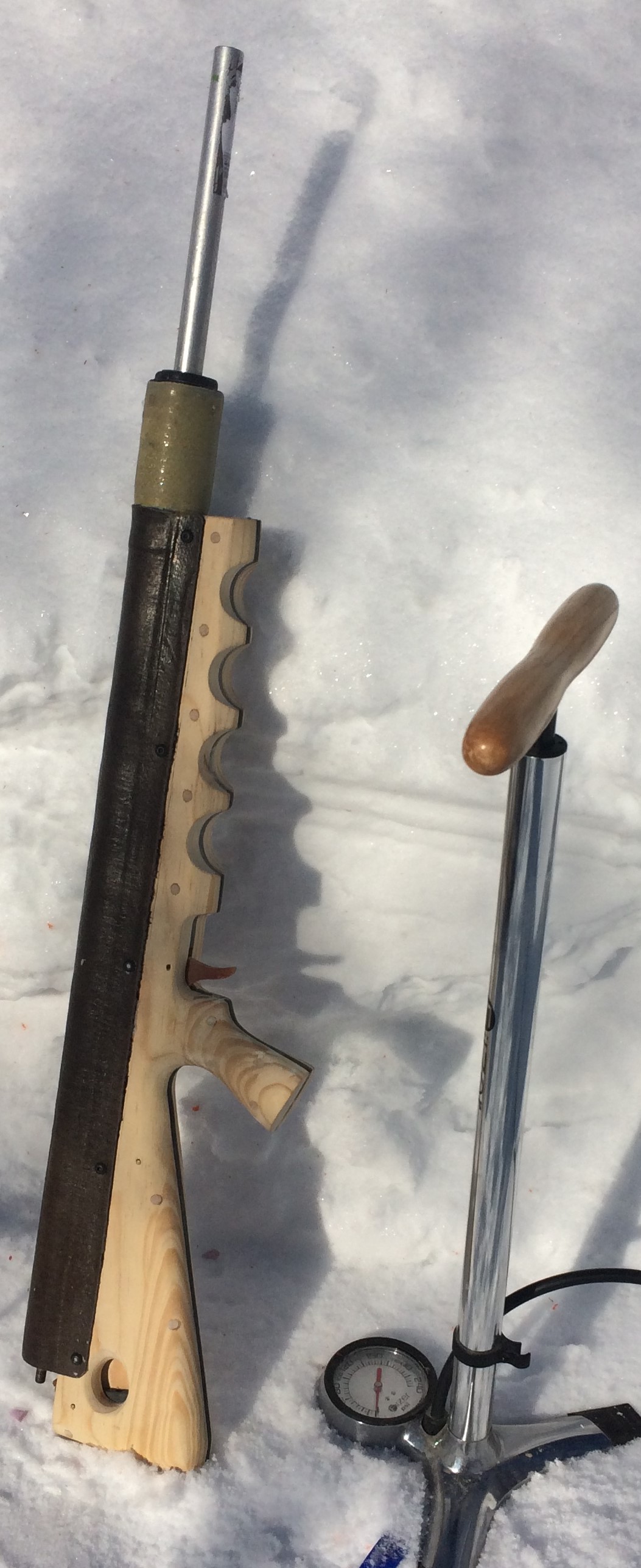 Short story: This is the Bullshark, rebuilt in bits from my MK 2 back in 2003, standard piston valve muzzleloader, .64 cal currently shooting marbles at 240psi. Overall length 38" , overall weight under 5 lbs, mechanically triggered