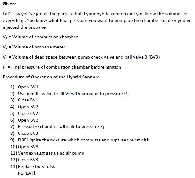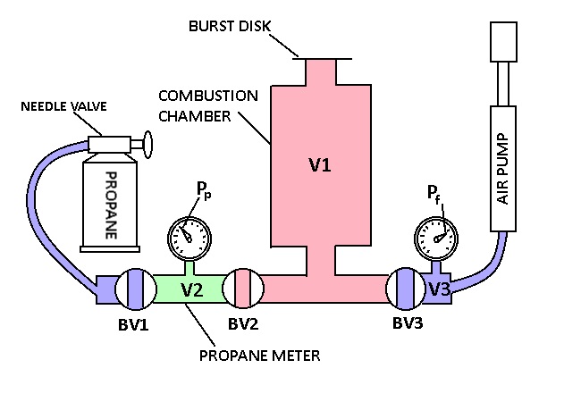 This ^^^ approach worked great for my smaller combustion cannons with small fuel meters. Also, if the ball valves used have a large internal volume inside the ball that is significant you can use my diagram to tell which valves should be considered as which volumes as denoted by the colors red, green, or blue.