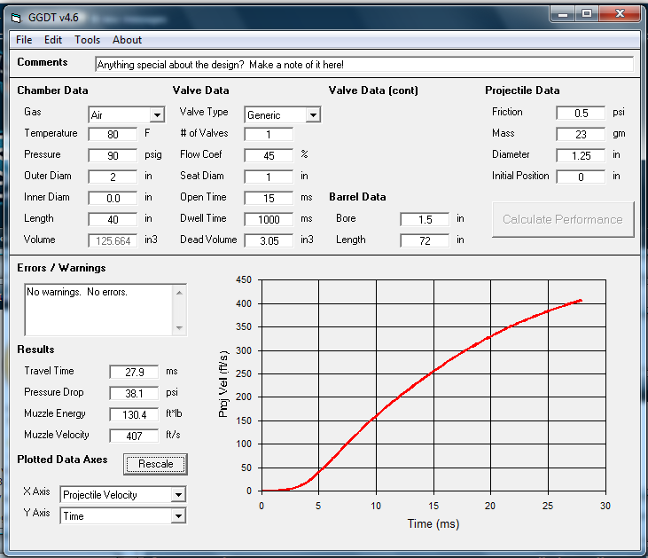 this programs just full of handy surprises. You were just about on par the program spit out a range of 186ft. haha I am compressing the air with a 120v car inflator. I have a compressor on my vacuum former that i could temporally cannibalize but with this being made out of schd 40 PVC i think 110 is a good max psi. I pressure tested everything in the industrial lab at the college to 150psi. But were this will be used by people other then me I cant take as much risk with there safety as i can with mine. The field owner may just kill me if his insurance goes up haha