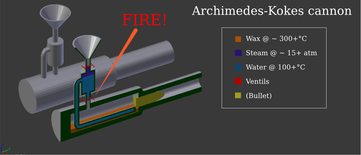 I suppose there were problems in ancient times regarding materials. The cannon was probably never fired with a bullet. However it seems probable it was used as a flame-thrower, which was being used and we have no idea what it looked liked and how it worked. Today it could be used as an external combustion engine. The L-pipe going into the wax was added by me, it results in higher steam pressure. In true Archimedes' cannon it would be cut short and sealed.