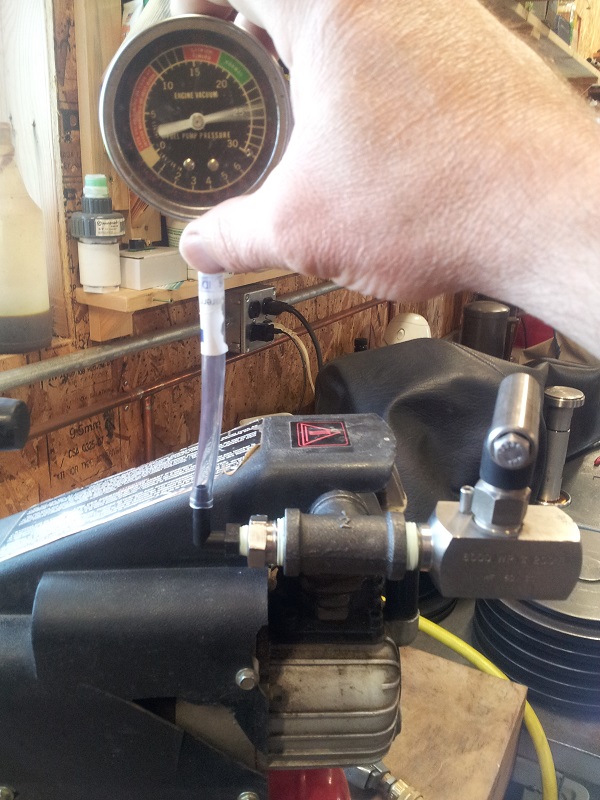 Have yet to buy a vacuum pump for the garage, but I did have an old piston type compressor kicking around....couple fittings and a 1/2" needle valve from the junk bin threaded into the inlet and.....