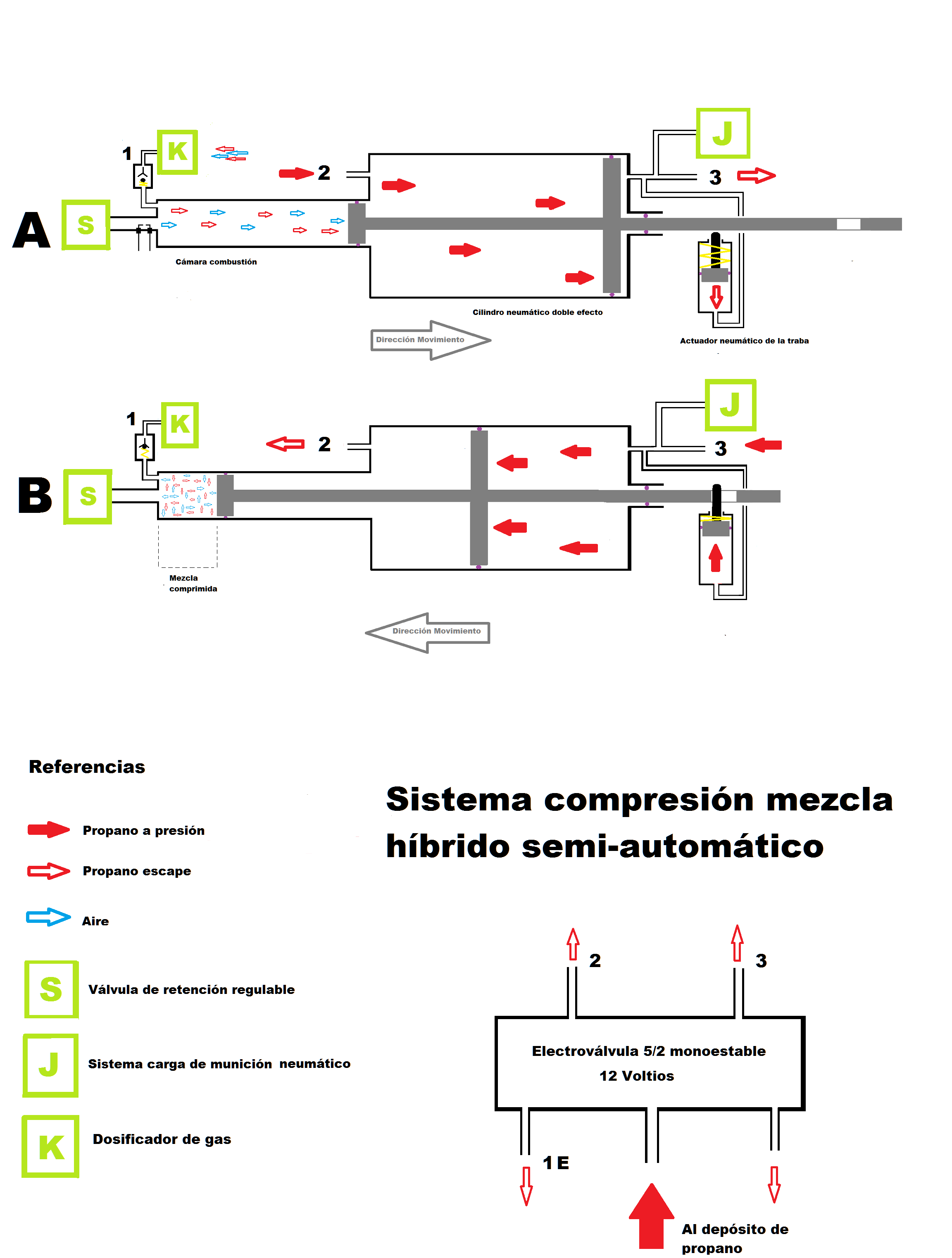 The idea is to use the pressure energy of propane in a tank (about 7 bar at 15 C) to compress the hybrid mixture, leaving all the energy of the deflagration of this stoichiometric mixture in the combustion chamber , To boost the ammunition of the weapon. The system uses, in short, the heat and pressure energy of propane.