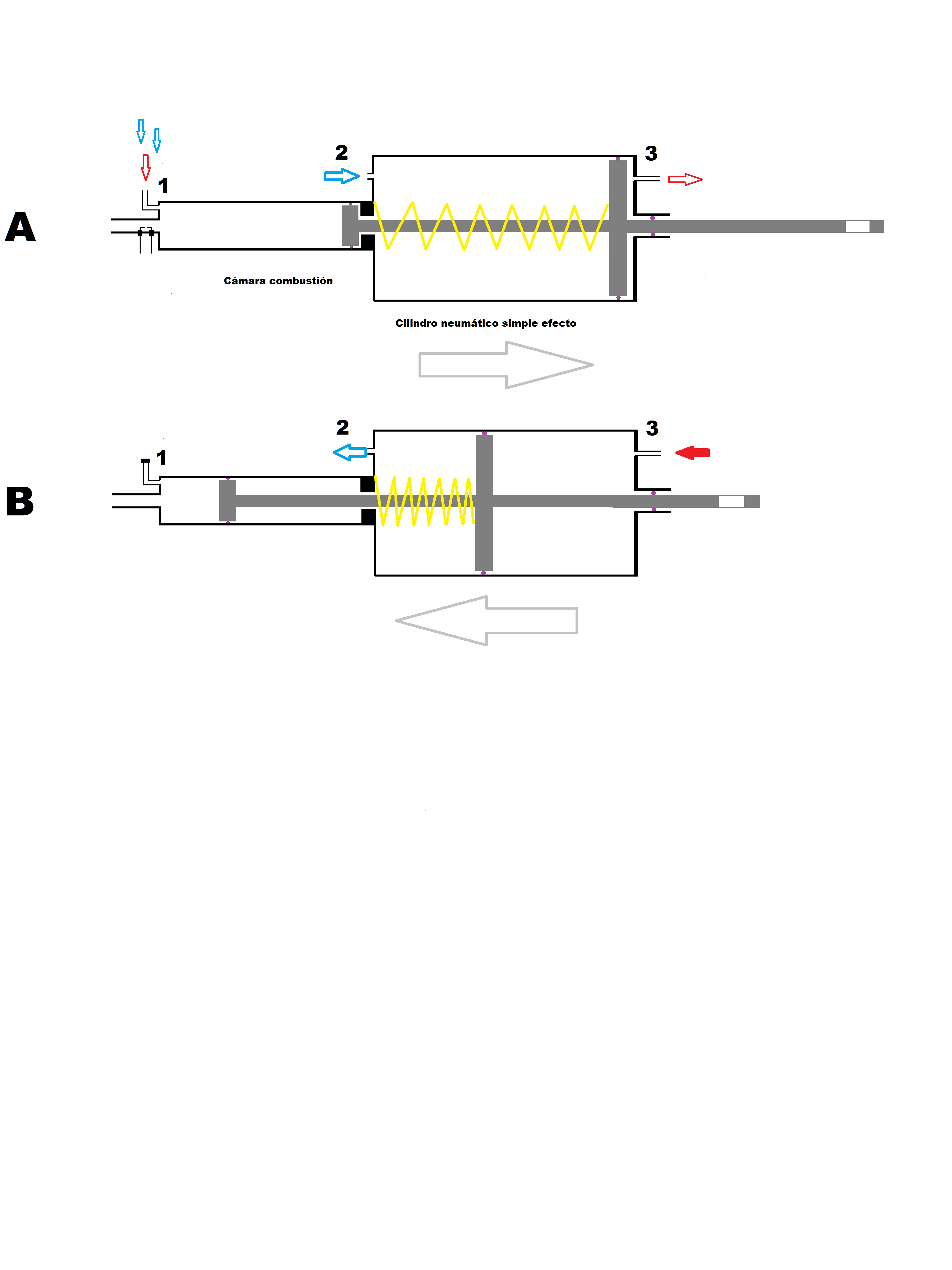 When the larger piston reaches the right end, the rod actuates an electric switch that changes the position of the solenoid valve 5/2, and the entire stem assembly and the two pistons move to the left, ("B" position of the diagram) , The compression of the mixture being produced in the combustion chamber of the smaller piston.