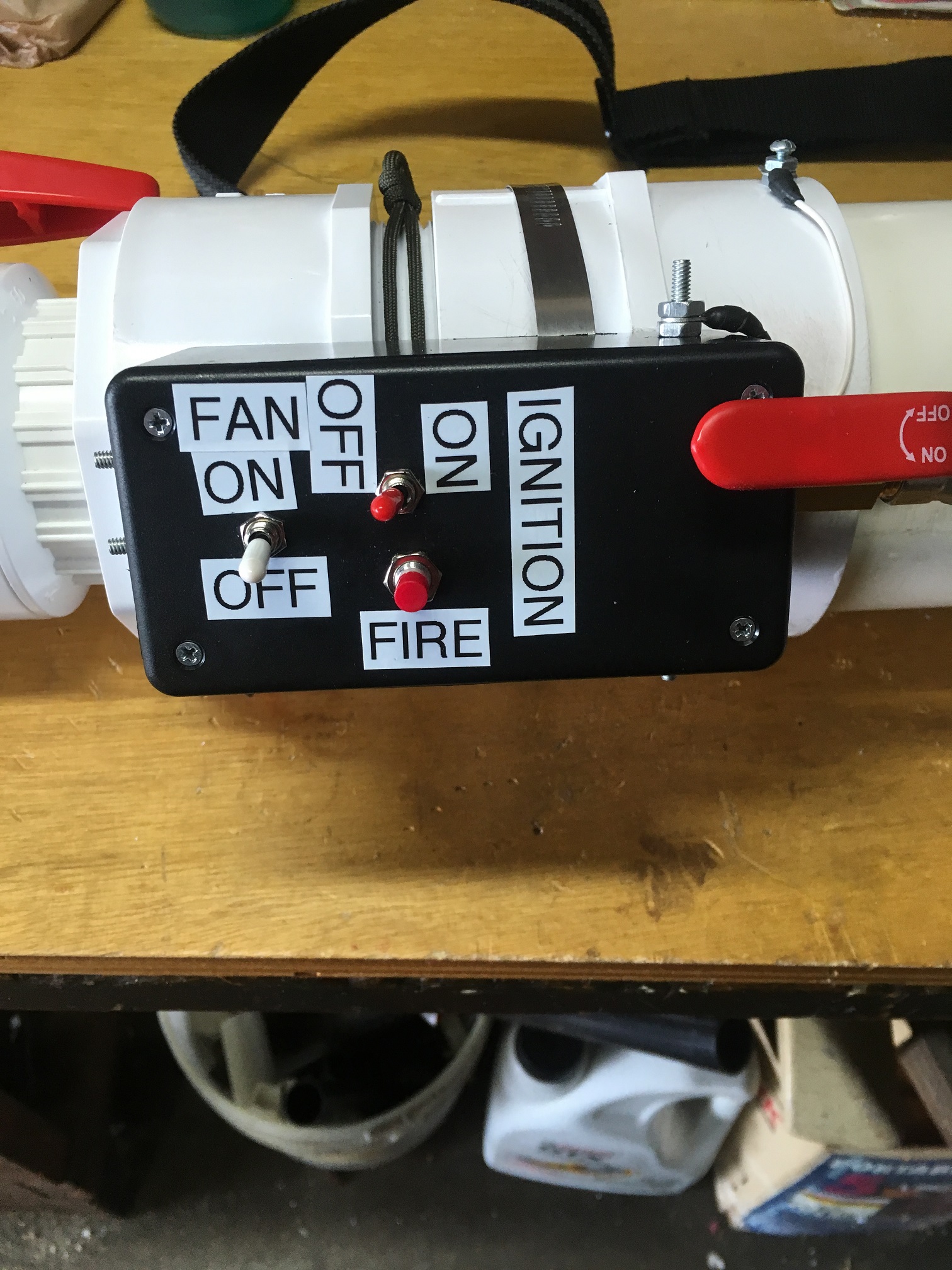 I have attached a few pictures of the updated electronics with the switches relocated to the edges and the battery pack velcroed on top. So far a quick bench test shows that the fan is spinning much faster and the spark sounds as strong as ever. My only worry is that the high kV module will draw too much current but it shouldn't matter in short bursts.