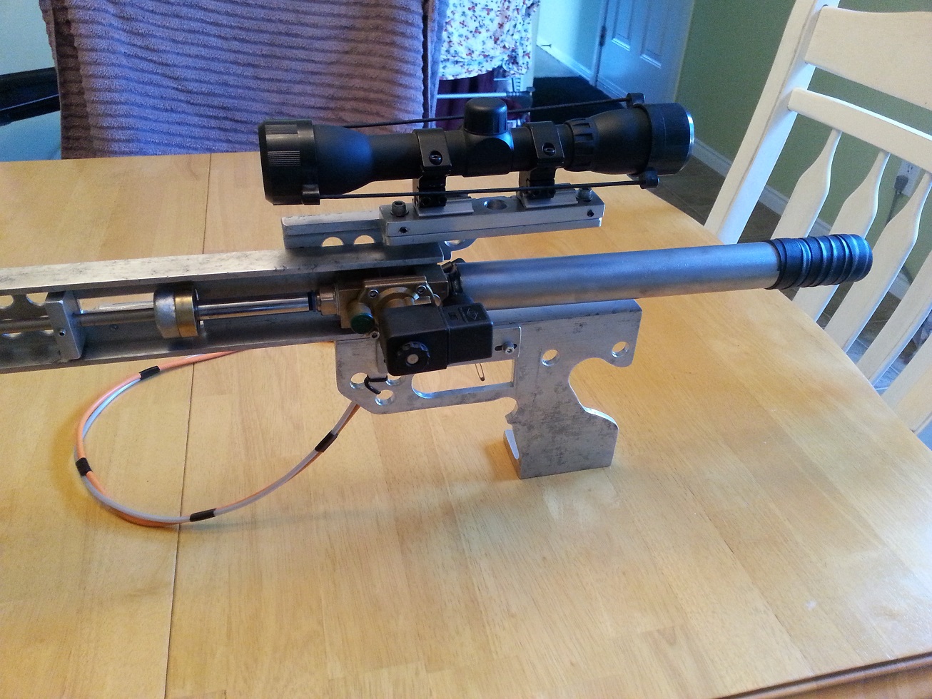 .177 smooth bore (.183" ID seam less tubing). Barrel is 750mm long and uses a 24vdc solenoid valve, chamber is 1" x 12" sch40 stainless steel charged to 150psi from my compressor. Single shot bolt action. BB's not so accurate but the dome head lead pellets are pretty good