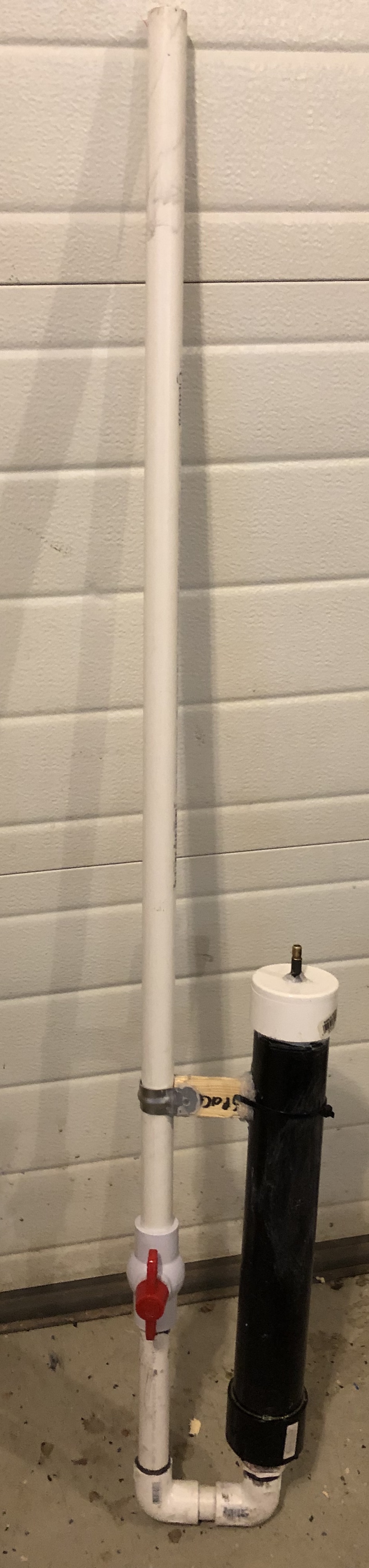 I was at the hardware store a few days ago and I thought “Why not make my 9th spud gun?”. Do I did. It managed to stick a blowgun dart in my garage door from around 10 feet at 100 psi and it shot through 3 or 4 layers of cardboard prior to doing that. The thing that makes it special (for me, at least) is, the barrel slides forward and I can load stuff in like that instead. I haven’t done a range test but I bet it would go 50 to 100 metres. The spacer is a piece of wood (the writing says spacer so I wouldn’t accidentally throw it out) and a bent 35 cent bracket.