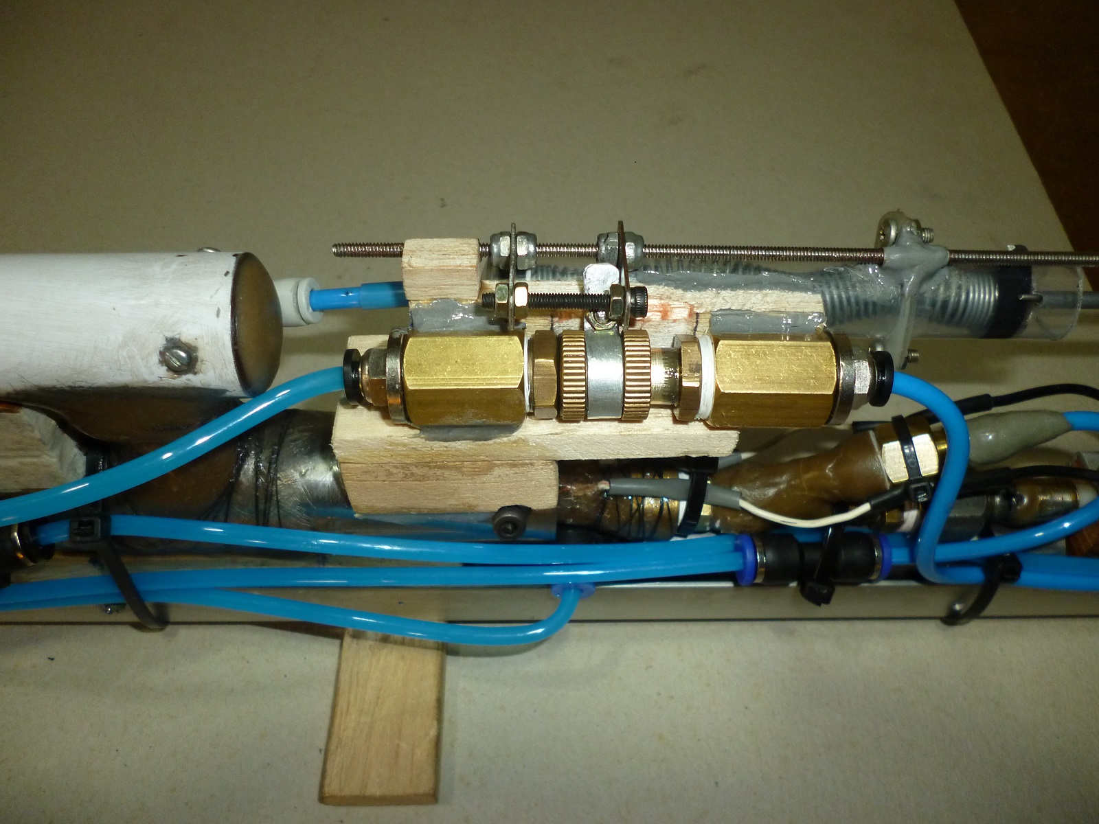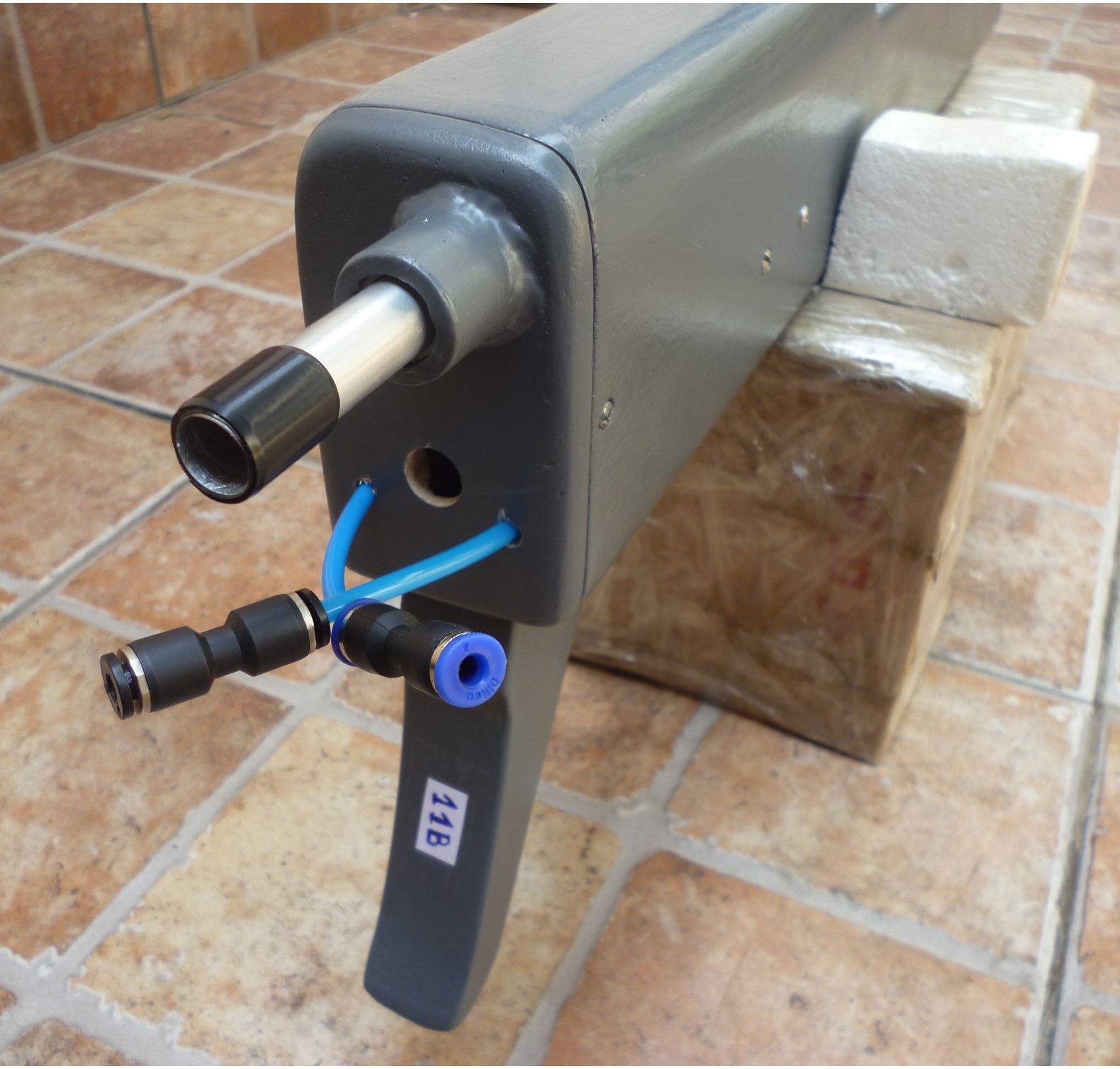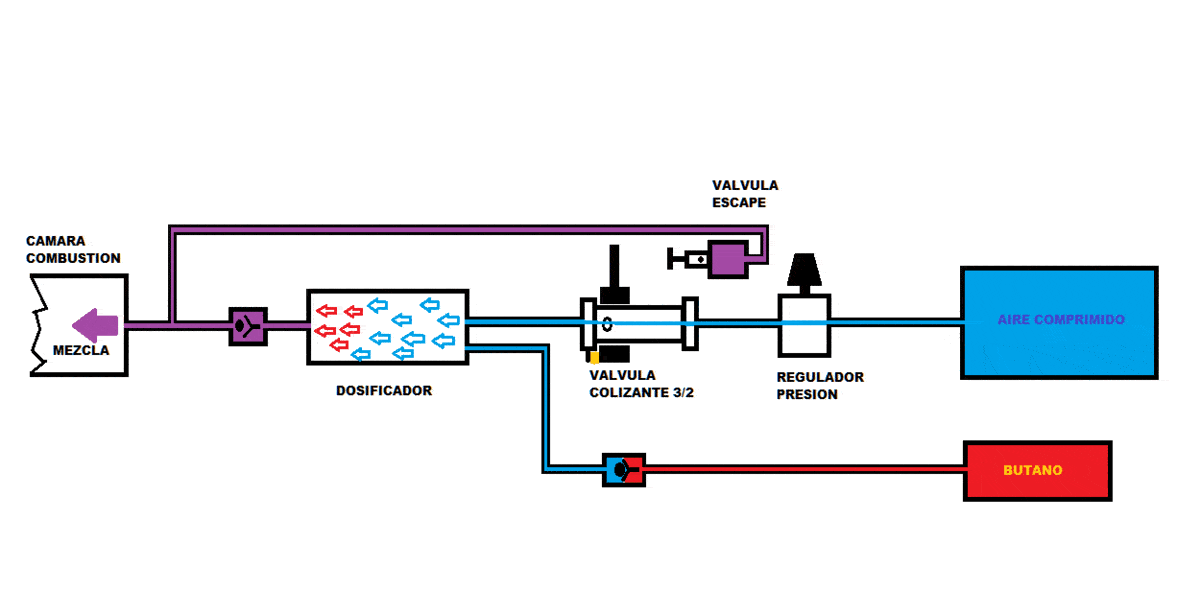 The "Pneumatic timer" is used to determine the gas inlet time to the doser, about 1.5 seconds. The idea is simply to pull the handle and release. This automatically performs the opening and closing of the exhaust valve, the gas charge and its dosage, and the butane-air mixture charge in the combustion chamber. The system is relatively wasteful, a little air, (is a problem that solves many other problems, more important), in favor of having on board the weapon, the smallest possible number of elements.