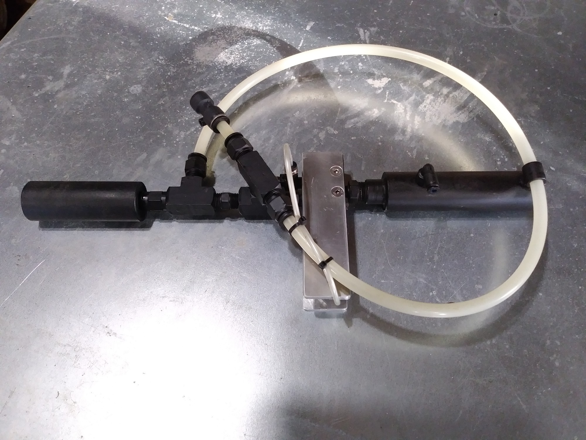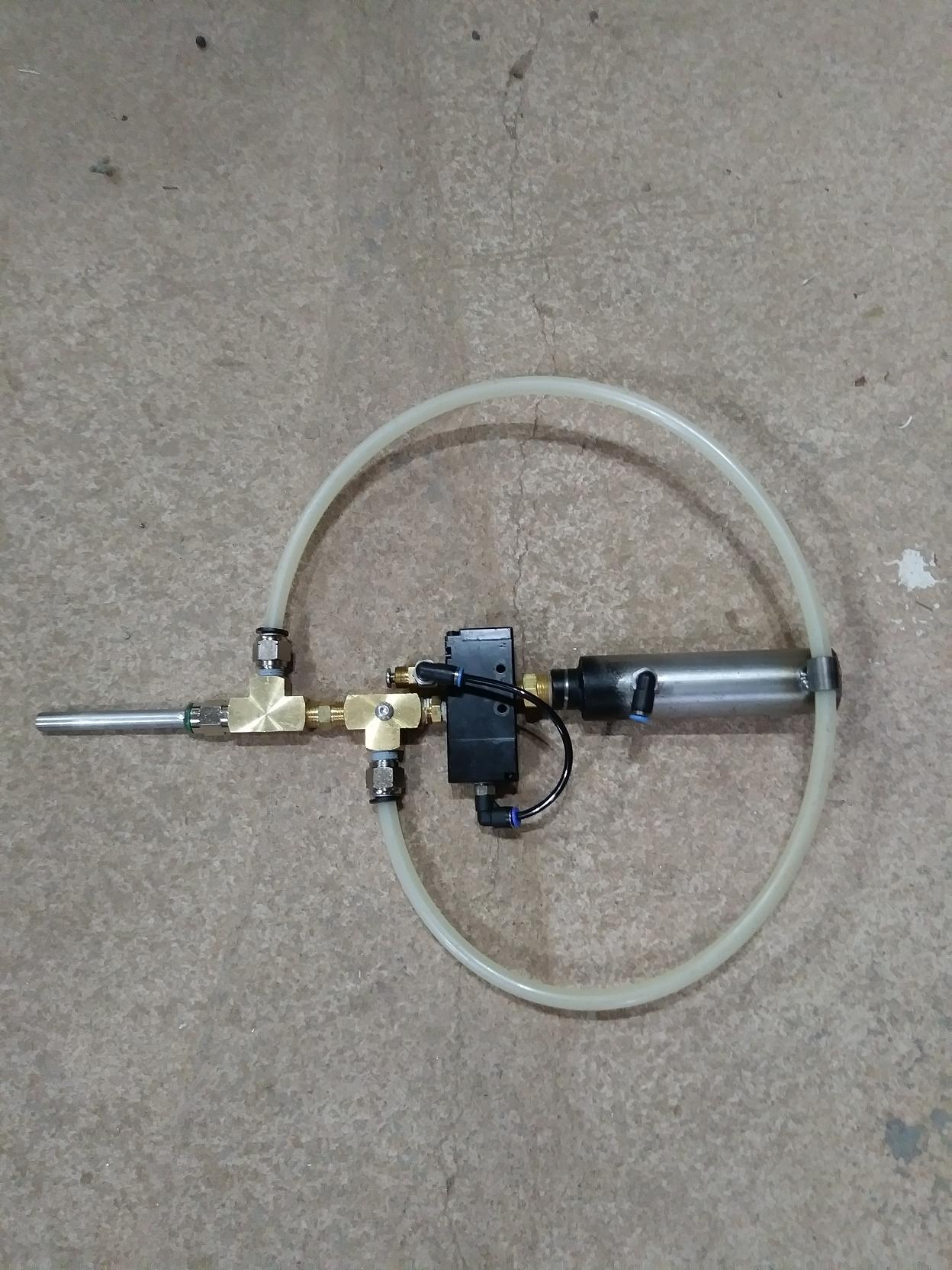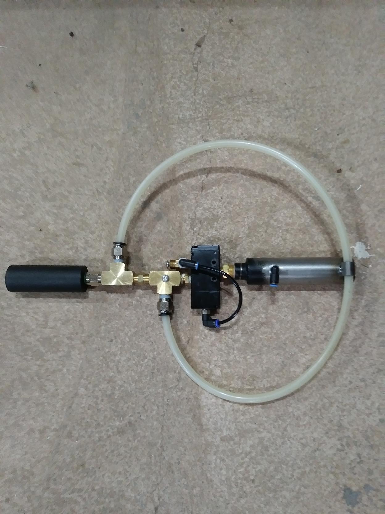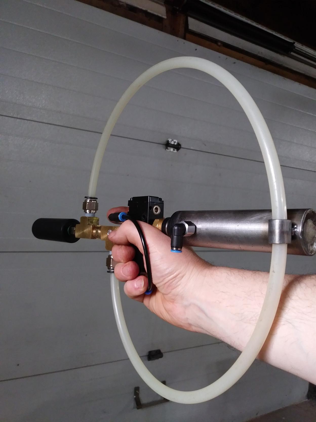 I sort of made a full auto pistol from pieces I screwed together, the chamber is the only piece fabricated. Holds 130 bbs, rate of fire is insane, can get 4 bursts if I'm quick on the trigger. Compressor connects to the small fitting on the chamber at 150psi. The valve is a 5/2 1/8"' port pilot operated, the trigger is screwed into the valve and takes air from the normally open port. Want to try a T fitting on the magazine tube to make filling easier.