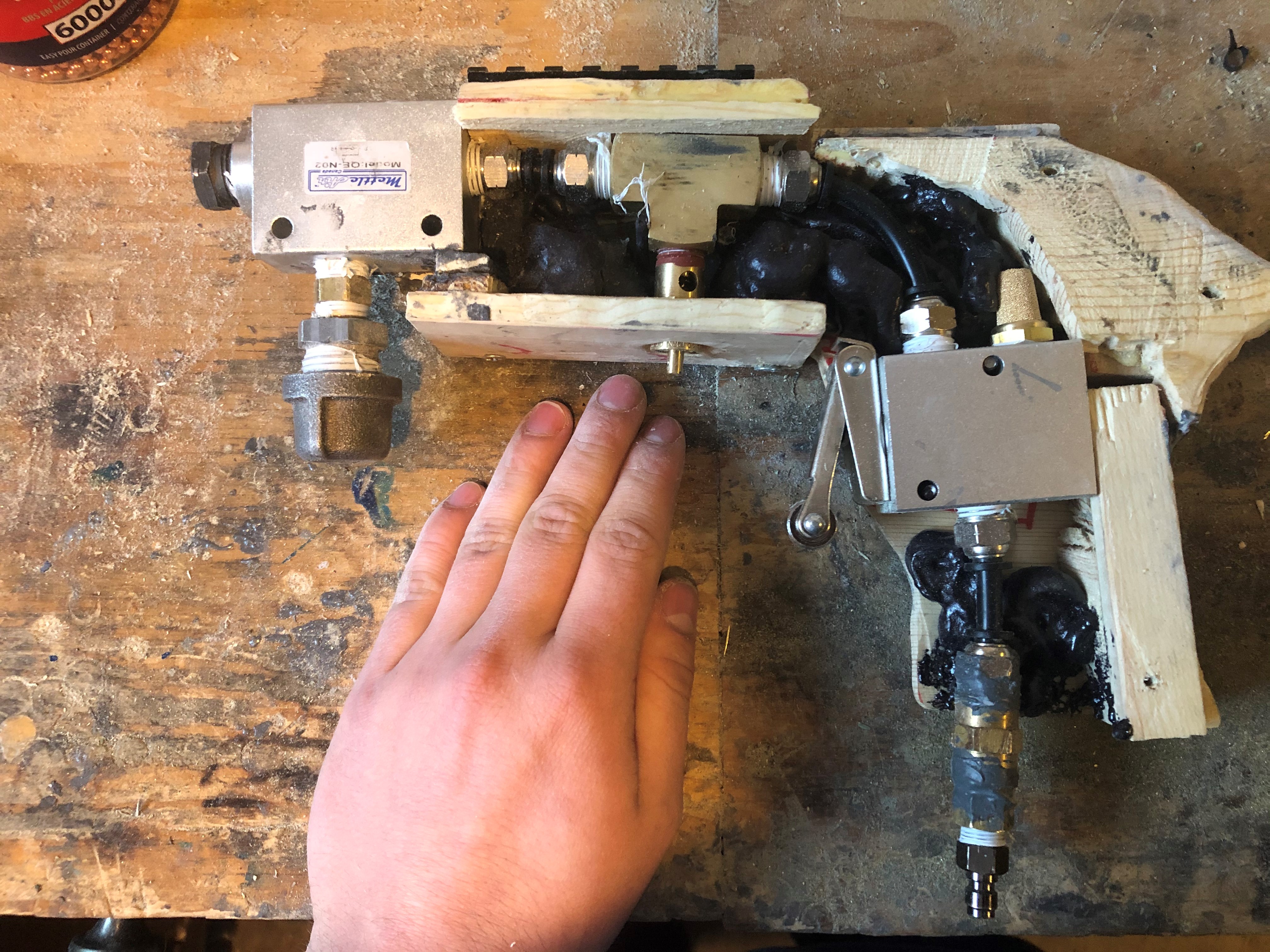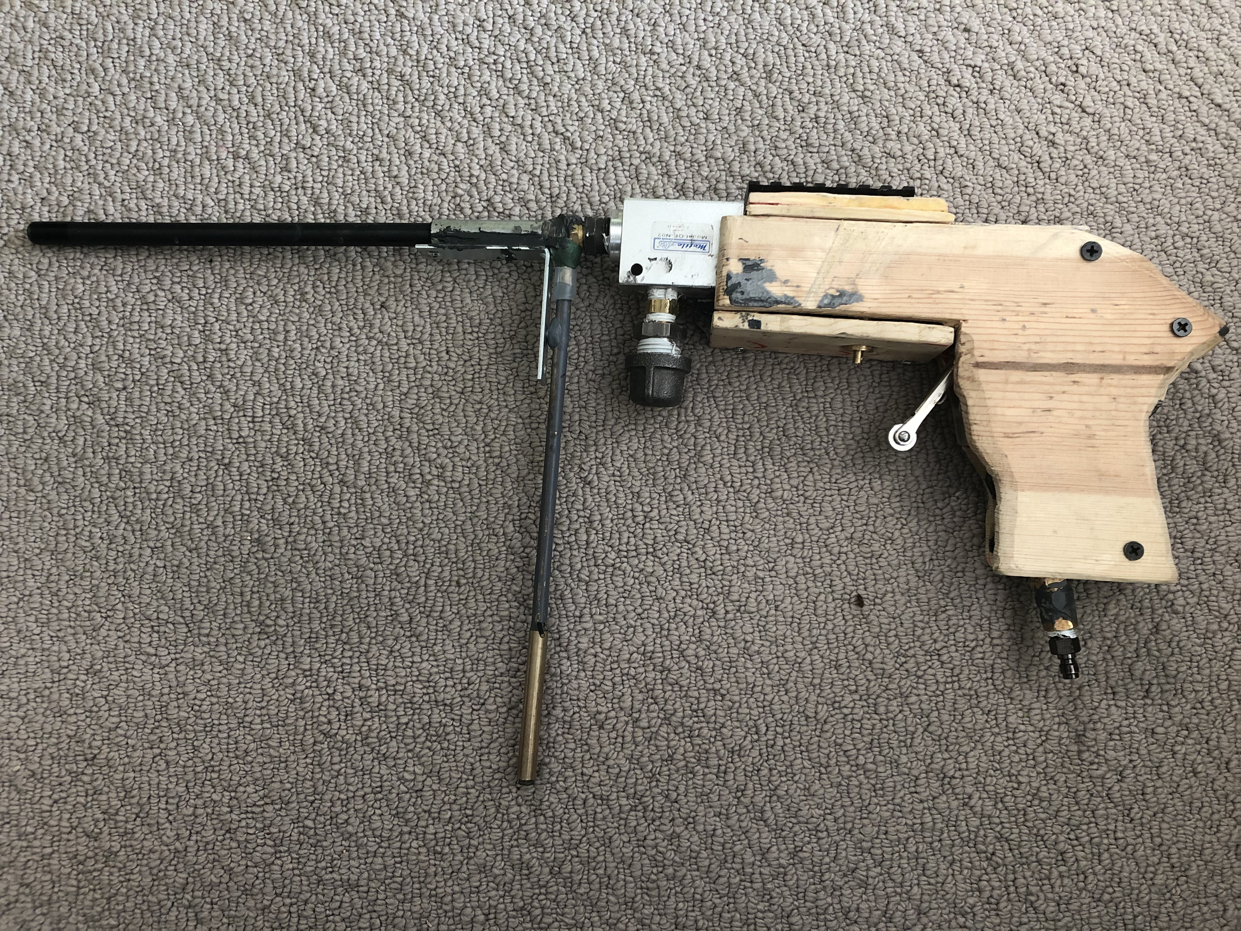 Oh, here is an overview of the gun if anyone is interested. And these are the internals. The insulation foam is to muffle the sound of the popoff valve. It may not look very pretty now, but with some wood filler and stain, I hope to have look a little nicer than the "random plumbing parts and pneumatic valves" current aesthetic.