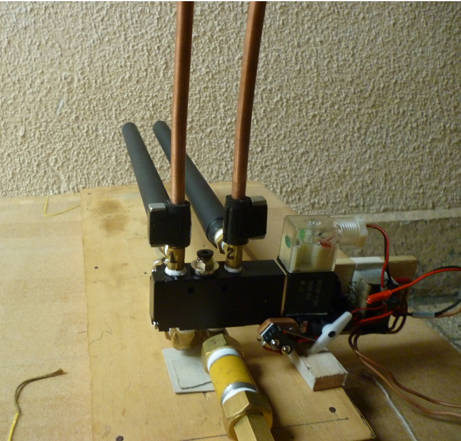 The system to activate the solenoid at the desired frequency is a modified servo motor, a push button, and a small li-po battery.