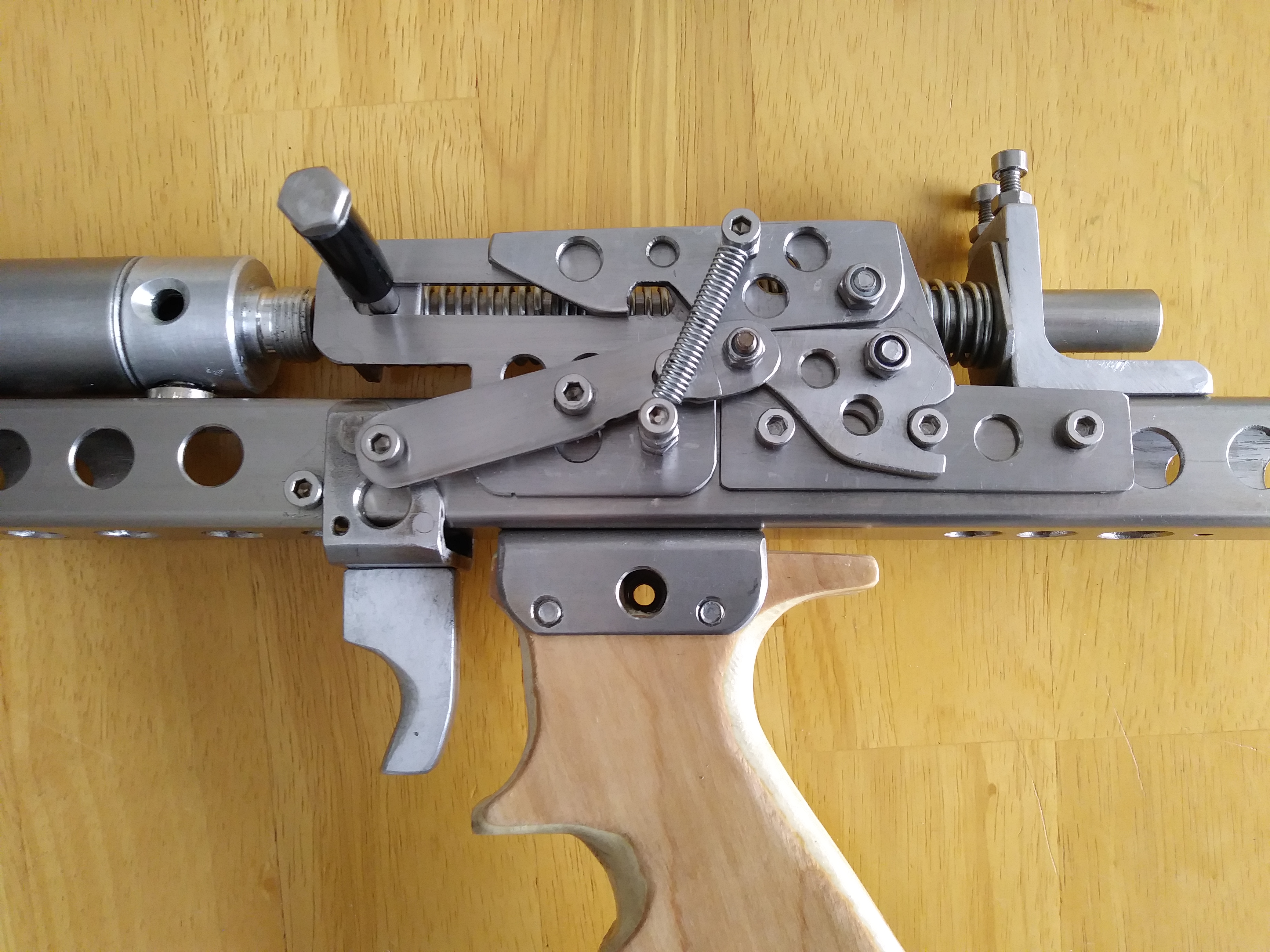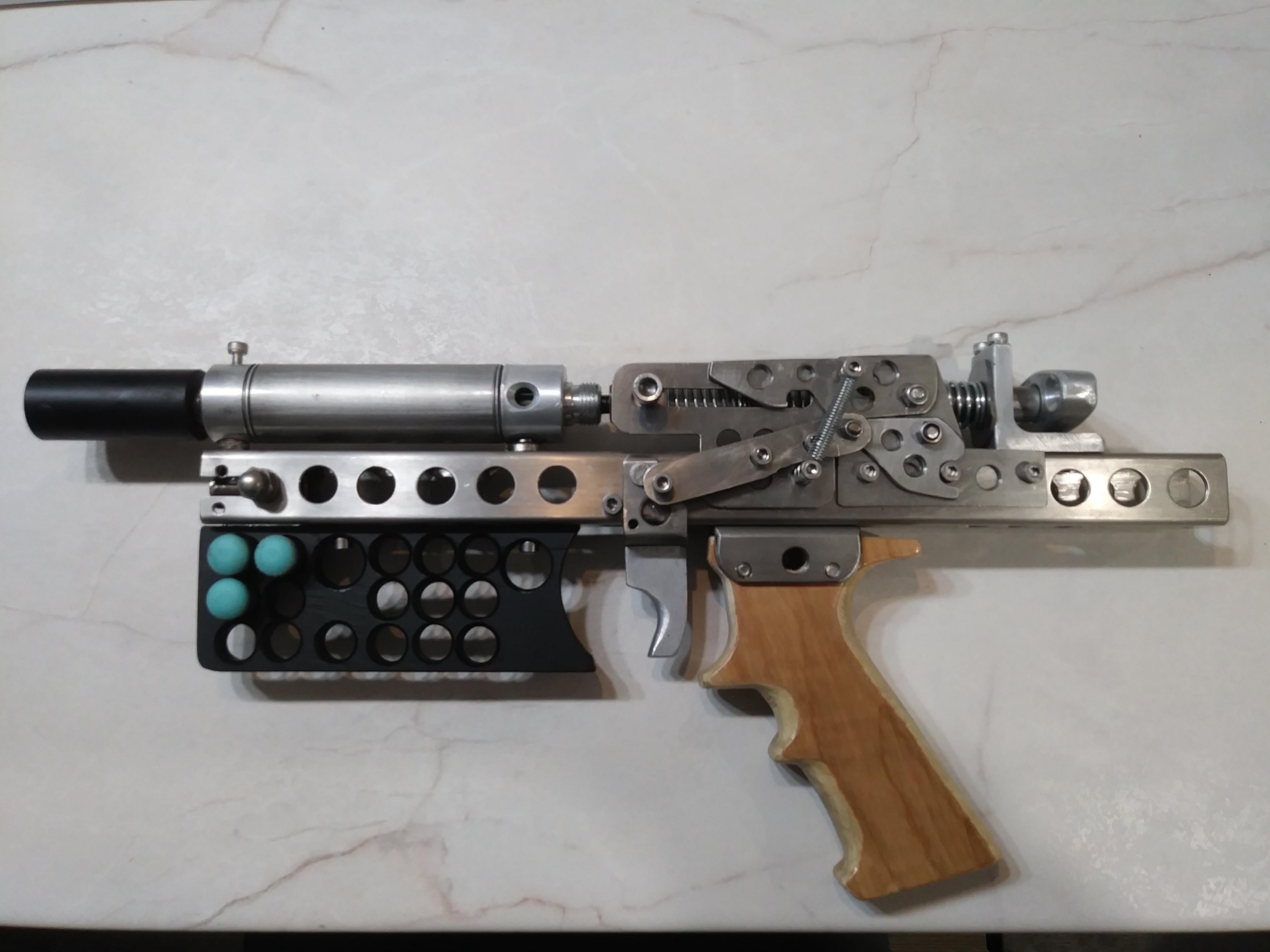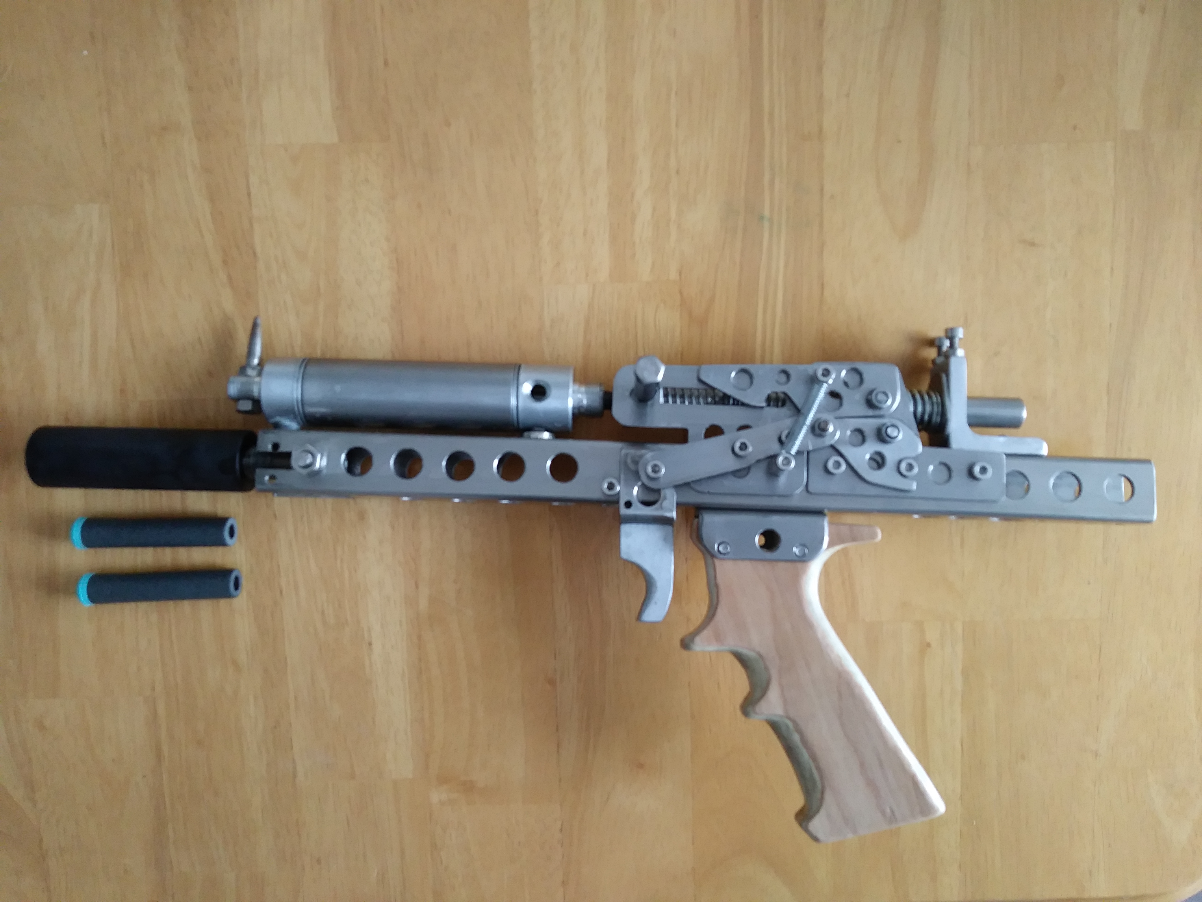 Final version with onboard storage, barrel cut down and moved to end of piston, spring cocking from the rear, fires half length Xshot darts at 100fps, much fun indoors