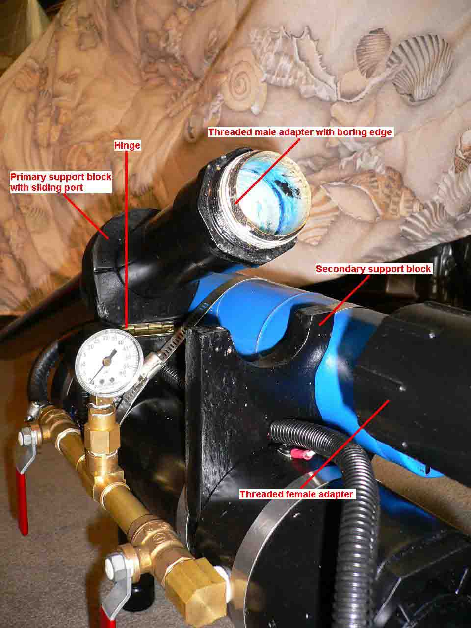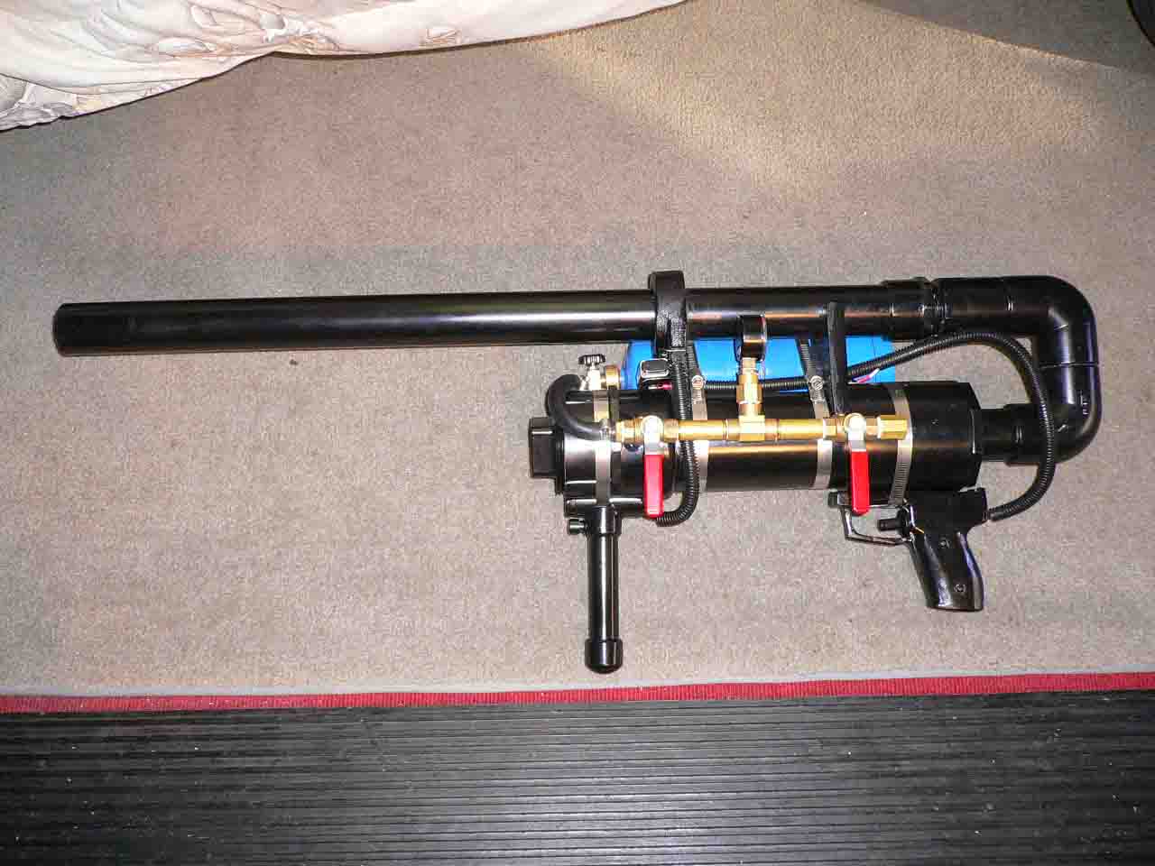 Modifications: Diametrically opposed spark gaps with dual ignition using a chamber short (burnt latke), Friction mounted chamber fan with on/off button and 9v battery pack, Custom built trigger frame with removable faceplate, hinging support block for breechloading, Quick interchangeable barrel ability, Exhaust end cap, onboard propane injection system including meter pipe and 0-60 p.s.i. pressure gauge, Krylon Fusion paint job, gun reloading stand (not pictured) made of 2x4 and padded with stapled-on towel cut to size.
