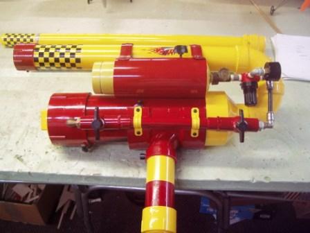 dang thats pretty cool. i was thinking of building somthing similar to that in the near futere... except in not over and under. does it perform the same as if the chamber and barrel were ailigned(excuse my spelling).sweet chamber fan, how big is it? also i like the paint job, looks like a crash test dummy would be weilding it.