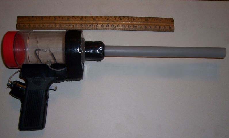 For the ignition picture I clamped the gun in a vice and used the shutter speed adjustment on my digital camera to keep the shutter open while the butane burned.