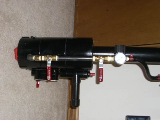 Also, the laser sight is actually a 500 yard range laser pointer made for construction engineers. I cased it in a 3/8 nipple, then sleeved that into a 3/4 pvc t with end caps. The threaded brass cap is used to turn it on. It had a small button on the side of the pen that I glued down. I then soldered the battery cap on the rear of the pen into the brass cap so when I tighten the brass cap down on the nipple, it pushes into the back of the batteries and turns it on. Sounds complicated but it really wasn't hard to do.