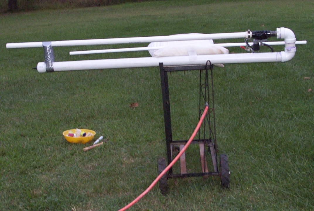 It works better than I even thought it would ,it is so loud when it shoots that I lenghtened the barrel to 75" and it may need more.It seems to shoot about a quarter mile. The ram is opened via a blowgun which taps air from the cannons air tank. I built the ram out of 1 1/2" pvc ,a long bolt ,two washer ,two nuts, piece of ruber,two endcaps,one fitting to let air in. So far I have only launched potatoed in it but I have a tennis ball barrel that will fit it.