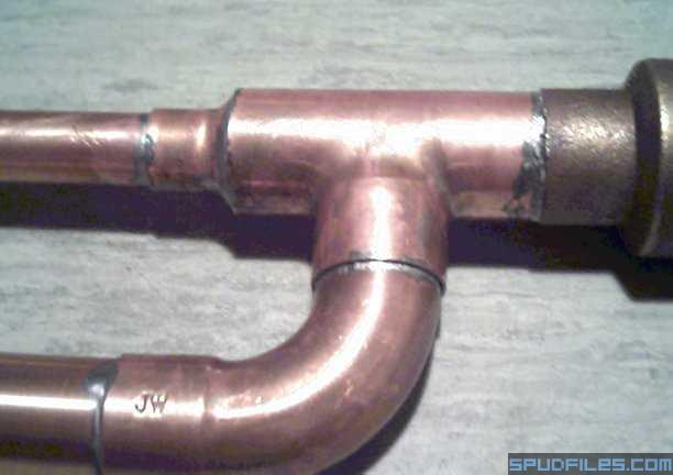 - The bulk of the soldering was on the tee, where the chamber, barrel and connector all come together. It was a bit complicated to get everything lined up, since I had to heat and solder all the parts in sequence, to prevent the heating one joint from breaking another. The barrel came on slightly askew, but with some grinding on the end, it seals perfectly. The soldering on the brass connector wasn't airtight in the first try, probably because I hadn't heated the large brass fitting enough, but it was successful on a second try. A piece of 28mm pipe is used to connect the brass fitting to the tee, the piston slides inside this piece of pipe. You can see I've begun to polish the chamber.