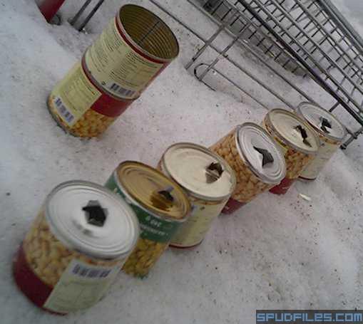 Finally, what I was planning to do was to see how many tin cans I could shoot a marble through. I took the eight ones I had brought and stacked them together, and braced them against the shopping cart. - birchhole.jpg (19.45 KiB) Viewed 14591 times