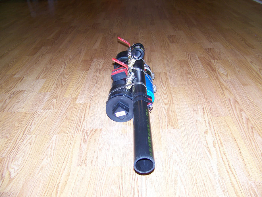 It has a 18'' chamber made out of 3'' abs, a 30'' barrel made of 1.5'' abs It also has a laser sight (gettho, but it works)