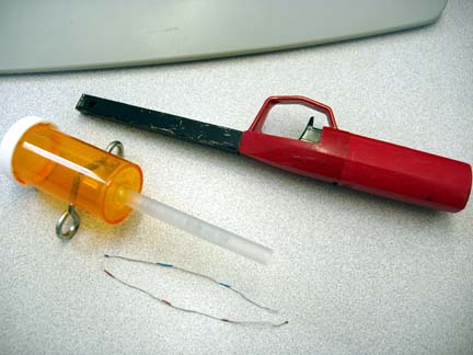 A friend of mine recently turned me on to the whole spud gun thing. After seeing everyone else's creations I have been itching to build my own. I don't have a ton of hardware lying around, and I wanted to get something going now, so I decided a mini pill bottle cannon would be a good shooter to start with. I put this thing together in less than an hour (had to wait for the epoxy to dry). I based it on PCGUY's pill shooter with my own modifications. I used a clear 2" pill bottle, a clear pen cylinder, two of those little hook screws used for hanging things, and a clicker and wires out of one of those long click lighters. It's very basic, but quick and very easy to make.