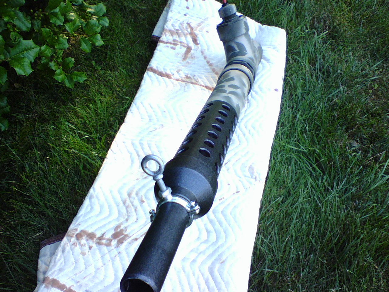 Three weeks ago I had never seen a potato gun. Two weeks ago I made my first gun. This weekend I made my second gun. This gun is simular to my first design. This too rockets potatos very far with the first click of the Weber igniter. It has a 3" chamber "T" and a 1.5" barrel but this one is longer at 36". It also has a slight reverse bevel so your "ammo" has a nice tight fit every time. What makes this gun special is the attention to the details. The barrel "guard" took forever to make the right way, but was well worth it. The upgraded 3/4" bronze ball valve with custom handle is a nice touch as is the front "sight", but its the killer paint job that makes this gun. Krylon "Fusion" type paint for plastic is the way to go. Even my wife, who is less than thrilled that I spent all day Saturday making my second potato gun in two weeks, was impressed. Thats good enough for me. Good spudding