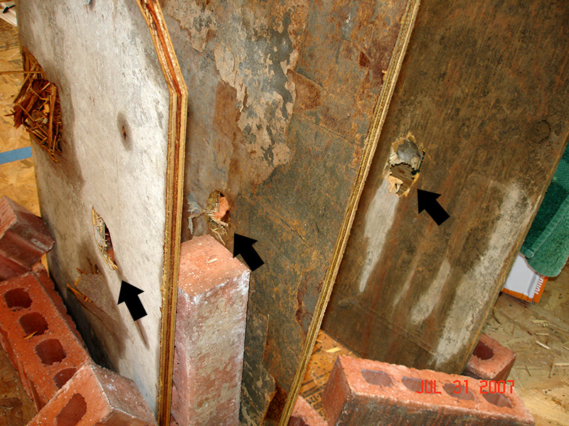 With the help of two more pieces of plywood (another 1/2" and a 3/4") and some bricks and towels, I was able to give it another go, this time, in my garage. At a distance of about 15', the projectile made it nicely through all three pieces of plywood and was luckily stopped by the mass of old towels I had draped over a box.